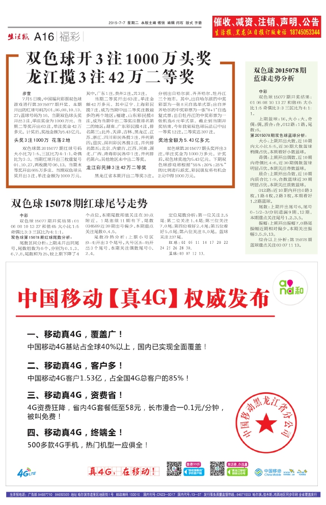 双色球开3注1000万头奖龙江揽3注42万二等奖