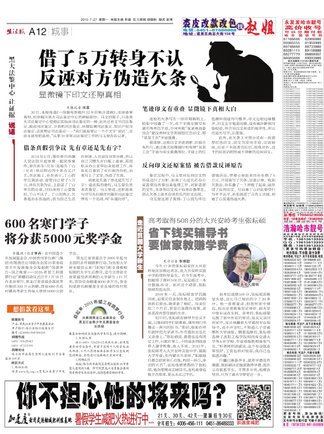 本报记者宋菲 20日,本报报道《一张脑电图揭开22年前枪击遗祸》,还原悬案真相,初步揭开黑大司法鉴定中心的神秘面纱。马文的案子,只是黑大司法鉴定中心受理法医临床司法鉴定的一种,此外还有文书司法鉴定、痕迹司法鉴定、计算机司法鉴定、环境监测司法鉴定、知识产权司法鉴定、法医物证司法鉴定……“我们就是要让一个个文字‘说话’,还原本该有的真相。”从事30多年司法鉴定工作的马玉堃告诉记者。 借条真假引争议先有章还是先有字? 2014年6月,鄂伦春自治旗人民法院开庭审理一起民事案件,原告孙东(化名)是被告丁山(化名)单位附近的个体仓买户主,在法庭上,孙东表示,丁山的单位搞活动,曾管自己借了5万元,并有欠条为证,上面盖了丁山单位的公章,但后来向丁山要钱时,丁山不认了。丁山则表示,欠条是孙东伪造的,因为自己生活在林场,人员居住非常分散,所以自己习惯先在白纸上盖章,再把纸从办公室带出来处理工作,孙东私自拿到了有印章的白纸,后来写上了文字,伪造了欠条。 到底是先盖了章还是先写了字?受法院的委托,马玉堃负责本次鉴定。马玉堃说,这种盖章与书写先后顺序问题在司法鉴定界有一个名词,叫“朱墨时序”。 笔迹印文有重叠显微镜下真相大白 送检的欠条写在一张印刷稿纸上,纸张中间叠了一下,在下半部左侧写有署名等黑色字迹,中间有枚“某某林场委员会”蒙汉两种文字的圆型红色印文,和“某某工会”字迹重叠。 据观察,这枚印文字迹清晰、印痕分布均匀,通过体式显微镜仔细观察“某某工会”字迹与印文重叠部位,字迹上的红色颜料痕迹均匀整齐,印文边框边缘整齐,印文文字笔画完整,没有被冲断和污染痕迹,符合后印文形成的规律性,所以应是先写字,后盖章。 此外,在欠条上半部分还有一枚圆型红色印文,印文为反向字迹,印迹较淡,应是下半部盖完印后,纸张对折,没干的印泥沾附形成不清晰的反向印文。 反向印文还原案情被告借款反诬原告 鉴定过程中,马玉堃对反向印文的形成进行了分析,如果丁山是先在办公室盖章后再拿出来处理工作,对新盖章的文件,本该等印文风干后再折叠带走,那么欠条上就不应该有反向印文出现。 马玉堃还原了案情:丁山因为单位要搞活动,带着公章赶来向孙东借了5万元,并现场写了欠条,加盖公章。收到欠条后,孙东叠了一下并收了起来,就形成了反向印文。但后来丁山对此借贷行为不予认可,孙东就把丁山告上法庭,却被丁山反诬伪造欠条。