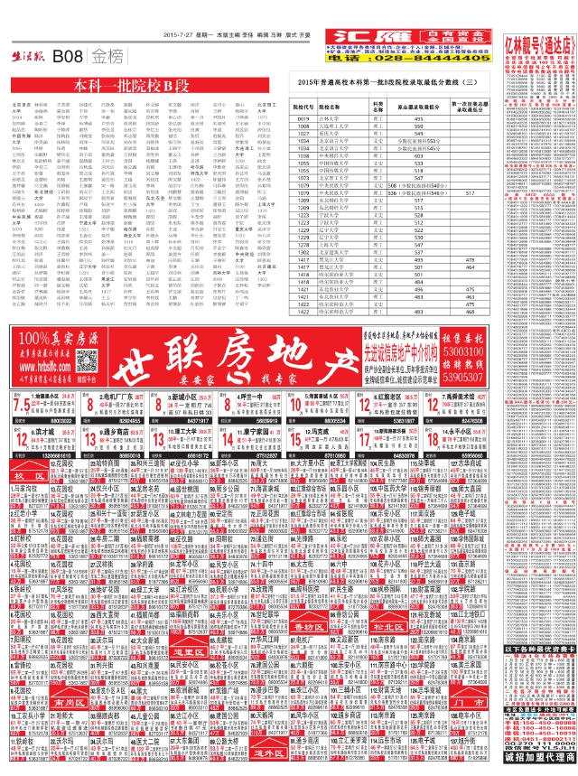 2015年普通高校本科第一批B段院校录取最低分数线(三)