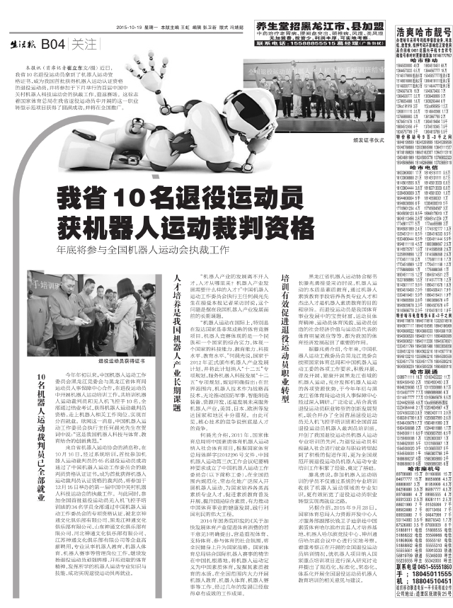 本报讯(首席记者崔立东文/摄)近日,我省10名退役运动员拿到了机器人运动资格证书,成为我国首批获得机器人运动认证资格的退役运动员,并将参加于下月举行的首届中国中关村机器人科技运动会的执裁工作,重返赛场。这标志着国家体育总局在我省退役运动员中开展的这一职业转型示范项目获得了圆满成功,并将在全国推广。 10名机器人运动裁判员已全部就业 今年年初以来,中国机器人运动工作委员会黑龙江竞委会与黑龙江省体育局运动员人事保障中心合作,在退役运动员中开展机器人运动培训工作,共培训机器人运动裁判员和无人机飞控手10名,全部通过结业考试,获得机器人运动裁判员资格,走上机器人相关工作岗位,实现百分百就业。欣闻这一消息,中国机器人运动工作委员会执行主任何晨光先生在贺词中说:“这是我国机器人科技与体育、教育结合的创新典范。” 来自省机器人运动协会的消息称,在10月16日,经过系统培训,首批参加机器人运动裁判员的45名退役运动员成功通过了中国机器人运动工作委员会的裁判员资格认证证书,成为首批获得机器人运动裁判员认证资格的裁判员,将参加于12月15日举办的第一届中国中关村机器人科技运动会的执裁工作。与此同时,参加全国首批退役运动员无人机飞控手培训班的34名学员全部通过中国机器人运动工作委员会的专项资格认证,被北京神通文化俱乐部有限公司、黑龙江神通文化俱乐部有限公司、山东神通文化俱乐部有限公司、河北神通文化俱乐部有限公司、江苏神通文化俱乐部有限公司等企业高薪聘用,专业从事机器人教育、机器人体育、机器人赛事等管理岗位工作,继续发扬退役运动员顽强拼搏、开拓进取的体育精神,发挥所学的机器人运动专业知识与技能,成功实现退役运动员再就业。 人才培养是我国机器人产业长期课题 “机器人产业的发展离不开人才,人才从哪里来?机器人产业发展需要什么样的人才?”中国机器人运动工作委员会执行主任何晨光先生在接受本报记者采访时说,这个问题是摆在我国机器人产业发展面前的长期课题。 “机器人运动在国际上,特别是在发达国家是非常成熟的体育竞赛项目,机器人竞赛体现的是一个民族和一个国家的综合实力,体现一个国家的科技能力、教育能力、科技水平、教育水平。”何晨光说,国家于2012年正式颁布机器人产业发展计划,并将此计划纳入“十二五”专项规划,服务机器人科技发展“十二五”专项规划,规划明确指出:在世界范围内,机器人技术作为战略高技术,无论推动国防军事、智能制造装备、资源开发,还是发展未来服务机器人产业,美国、日本、欧洲等发达国家和地区十分重视。由此可见,核心技术的竞争说到底是人才的竞争。 何晨光介绍,2011年,国家体育总局将中国素质体育机器人运动纳入社会体育项目,根据国家体育总局体群字[2012]96号文件、中国机器人运动第三次工作会议纪要精神要求成立了中国机器人运动工作委员会(以下简称工委),在全国范围内规范化、常态化地广泛深入开展机器人运动,为国家培养各类高素质专业人才,促进素质教育普及开展,提升国民综合素质,有力推动中国体育事业的健康发展,践行利国利民的伟大工程。 2014年国务院印发的《关于加快发展体育产业促进体育消费的若干意见》明确提出,营造重视体育、支持体育、参与体育的社会氛围,将全民健身上升为国家战略。国家体育总局结合国际机器人赛事的精华在中国扎根落地,将机器人运动定义为中国素质体育,发掘其素质教育的本质,在全国范围内大力开展机器人教育、机器人体育、机器人赛事等工作,经过几年的发展已经取得卓有成效的工作成果。 培训有效促进退役运动员职业转型 黑龙江省机器人运动协会秘书长滕兆勇接受采访时说,机器人运动的本质是素质教育,通过机器人素质教育手段培养各类专业人才和杰出人才是机器人素质教育的目的和宗旨。而退役运动员是我国体育事业发展中的宝贵财富,运动员体育精神、运动员体育风貌、运动员创造的社会经济价值与运动员代表的体育明星效应等等,都为我国的体育经济发展起到了重要的作用。 据滕兆勇介绍,今年来,中国机器人运动工做委员会黑龙江竞委会按照国家体育总局和中国机器人运动工委的各项工作要求,积极开展、普及开展、健康开展黑龙江省域的机器人运动,充分发挥机器人运动的各项资源优势,于今年年初与黑龙江省体育局运动员人事保障中心经过深入调研、广泛论证,结合我省退役运动员职业转型的创新发展契机,联合开办了全国首届退役运动员无人机飞控手培训班和全国首届退役运动员机器人裁判员培训班,开创了我国退役运动员机器人运动专业培训的先河,为退役运动员积极融入社会进行就业与职业转型起到了积极的促进作用,更为全国规范开展退役运动员机器人运动专业培训工作积累了经验,奠定了基础。 滕兆勇说,参加机器人运动培训的学员不仅通过系统的专业培训收获了机器人运动领域的专业知识,更有效拓宽了退役运动员职业转型实现再就业之路。 另据介绍,2015年9月28日,国家体育总局人力资源开发中心人才服务部副部长钱王子迪亲赴中国素质体育哈尔滨市宾县人才培养基地、机器人哈尔滨竞技中心、神州通信哈尔滨会议中心进行实地考察,着重考察正在开展的全国