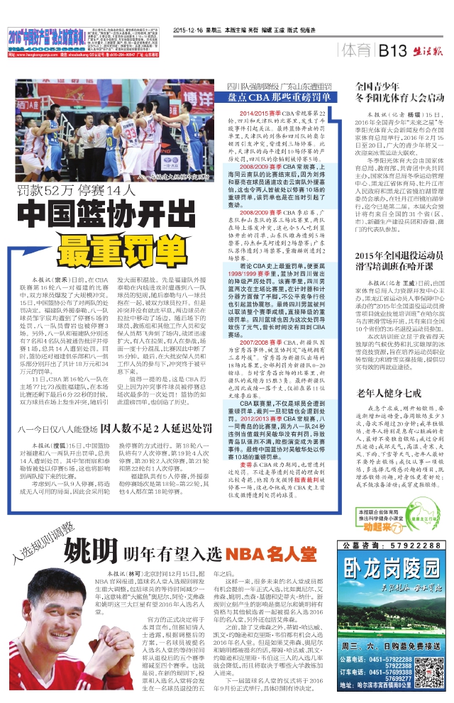 本报讯(宗禾)日前,在CBA联赛第16轮八一对福建的比赛中,双方球员爆发了大规模冲突。15日,中国篮协公布了对两队的处罚决定。福建队外援泰勒、八一队球员邹宇宸均遭到了停赛5场的处罚,八一队员曹岩也被停赛3场。另外,八一队和福建队分别还有7名和4名队员被通告批评并停赛1场,总共14人遭到处罚。同时,篮协还对福建俱乐部和八一俱乐部分别开出了共计18万元和34万元的罚单。 11日,CBA第16轮八一队在主场77比73战胜福建队,在本场比赛还剩下最后6分22秒的时候,双方球员在场上发生冲突,随后引发大面积混战。先是福建队外援泰勒在内线进攻时遭遇到八一队球员的犯规,随后泰勒与八一球员抱在一起,被双方球员拉开。但是冲突并没有就此平息,两边球员在拉扯中移动了场边。随后场下的球员、教练组和其他工作人员和安保人员都飞奔到了场内,战团迅速扩大,有人在拉架,有人在参战,场面一度十分混乱,比赛因此中断了15分钟。最后,在大批安保人员和工作人员的参与下,冲突终于被平息下来。 值得一提的是,这是CBA历史上因为冲突事件球员被停赛总场次最多的一次处罚!篮协的如此重磅罚单,也创造了历史。 八一与福建大规模冲突现场 四川队强制降级广东山东遭重罚 盘点CBA那些重磅罚单 2014/2015赛季CBA常规赛第22轮,四川和天津队的比赛里,发生了斗殴事件引起关注。最终篮协开出的罚单里,天津队的刘伟和四川队的奥尔顿因引发冲突,皆遭到三场停赛。此外,天津队的尚平遭到10场停赛的严厉处罚,四川队的徐韬则被停赛5场。 2008/2009赛季CBA常规赛,上海同云南队的比赛结束后,因为刘炜和蔡亮在球员通道攻击云南队外援嘉伯,这也令两人皆被处以停赛10场的重磅罚单,该罚单也是在当时引起了轰动。 2008/2009赛季CBA季后赛,广东队和山东队的第三场比赛里,两队在场上爆发冲突,这也令5人吃到篮协开出的罚单,山东队睢冉遭到5场禁赛,孙杰和吴坷遭到2场禁赛;广东队苏伟遭到3场禁赛,董瀚麟则遭到2场禁赛。 若论CBA史上最重罚单,便要属1998/1999赛季里,篮协对四川做出的降级严厉处罚。该赛季里,四川男篮两次在主场比赛里,在计时器和计分器方面做了手脚,不公平竞争行径也引起篮协震怒。最终四川男篮被判以取消整个赛季成绩,直接降级的重磅罚单。四川篮球也因为这次处罚导致伤了元气,曾长时间没有回到CBA赛场。 2007/2008赛季CBA,新疆队因为官秀昌事件,被篮协判定“违规拥有三名外援”。官秀昌为新疆队出场的18场比赛里,全部判罚为新疆队0-20输球。当时官秀昌出场的比赛里,新疆队的成绩为15胜3负。最终新疆队也因此成绩一落千丈,仅排在第11位无缘季后赛。 CBA联赛里,不仅是球员会遭到重磅罚单,裁判一旦犯错也会遭到处罚。2012/2013赛季CBA常规赛,八一同青岛的比赛里,因为八一队24秒违例当值裁判吴敏华没有判罚,导致青岛队强烈不满,险些演变成为罢赛事件。最终中国篮协对吴敏华处以停赛10场的重磅罚单。 麦蒂在CBA效力期间,也曾遭到过处罚。不过麦蒂遭到处罚的理由则比较奇葩,他因为发微博指责裁判被停赛一场,这也令他成为CBA史上首位发微博遭到处罚的球员。