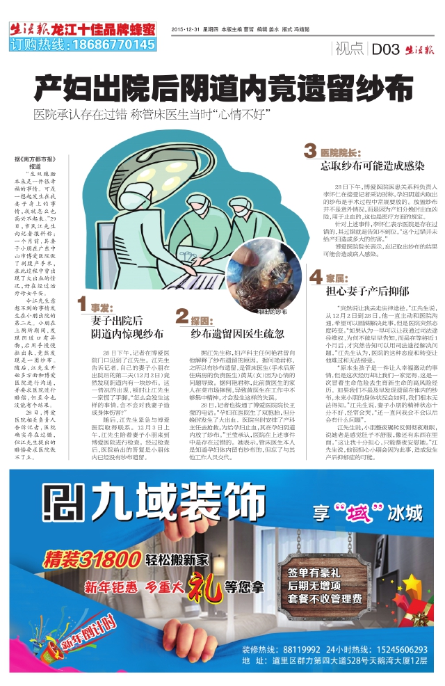 产妇出院后阴道内竟遗留纱布