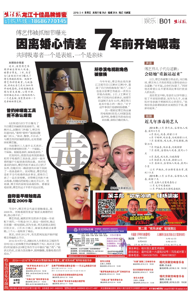 本报综合报道 近日,演员傅艺伟因涉嫌容留他人吸毒,被警方带走。3日,北京台《法制进行时》曝光了傅艺伟被抓现场。视频中傅艺伟神情凝重,几欲落泪,并承认自己是从2009年开始吸毒的,当时接触毒品因与前夫离婚,心情不好。同时她也承认一起吸的两人一个是表姐、演员黑婧环一个是亲妹妹傅艺敏。曾扔掉吸毒工具拒不承认吸毒 《法制进行时》节目曝光了当日傅艺伟被抓的现场细节。视频开头,民警在门外踹门,傅艺伟在屋内问,“谁呀?谁呀?”旋即民警破门而入,“别动,警察,不许动。”与傅艺伟同时被抓获的,还有黑婧环和傅艺敏。 当民警问三人是什么关系时,傅艺伟带着哭腔回答:“一个姐姐,一个妹妹。姐姐是表的,妹妹是亲的。” 在房间内,侦查员没有找到毒品和用于吸毒的工具冰壶,这时一扇开着的窗户引起侦查员的注意。面对侦查员的询问,傅艺伟拒不承认自己扔了东西,但随后另一路侦查员在楼下找到了一些冰壶碎片。面对物证,傅艺伟还是拒不交代吸毒的违法事实,谎称自己病了一直在家咳嗽。尽管傅艺伟拒不承认吸毒,但随后的尿检让她无言以对。经检测,傅艺伟的尿检呈冰毒阳性。看着尿检结果,傅艺伟这才不得不说出实情。 自称最早接触毒品是在2009年 节目中,傅艺伟交代最早接触毒品,是2009年。而吸毒原因竟是“跟前夫离婚的时候,我心情不好。” 傅艺伟说,被抓时所住的房子是她一年前租下来的,一年租金18万,最近一段时间,她正在拍摄一部电视剧,因为生病,两天前刚从剧组回到北京。2月25日晚上,妹妹及表姐过来看她,三个人一起吸食了毒品。 其实,早在2012年,有天涯网友就开始怀疑傅艺伟嗑药上节目。 2012年9月7日,网帖《有人在看河北卫视的节目吗?没人觉得傅艺伟好像嗨药了吗》,称河北卫视的《明星童乐会》傅艺伟在节目中貌似“磕了药”:“她语无伦次,注意力忽而集中,眼神飘散,很像吸毒后的反应。”所参演电视剧角色被撤换 今年年初,傅艺伟出现在浙江卫视节目《王牌对王牌》中,重演了自己的经典角色“妲己”,这也是目前傅艺伟最后一次在公开场合亮相。2日,《王牌对王牌》节目组向记者表示,该期节目录制于去年12月,傅艺伟只是其中很小的一部分,“对于这件事我们也感到很遗憾。” 另一部原定傅艺伟出演的电视剧《思美人》则紧急发表声明,称傅艺伟的戏份还未拍摄,剧组已确定换人。 声音 傅艺伟儿子代母道歉: 会陪她“重新站起来” 2日,傅艺伟被警方带走后,当日晚间,傅艺伟儿子高乐男发文替母亲向公众道歉:“对不起,让你们失望了。”同时他还希望公众不要再因此事而打扰亲人的生活。 高乐男文中称,母亲在52岁年龄上犯了不该犯的错误,其作为儿子,应承担对母亲疏于照顾和关心的责任。“我相信我会陪着妈妈在未来的日子里,重新站起来。” 链接 近几年涉毒的艺人 2014年:3月李代沫,容留他人吸毒,获刑9个月 6月张元,吸毒,拘留15日 6月宁财神,吸冰毒,行政拘留15天 7月张耀扬,吸大麻,涉及嫖娼,拘留20天 7月何盛东,吸冰毒,行政拘留 7月张默,容留他人吸毒,获刑6个月 8月高虎,吸大麻,行政拘留 8月柯震东,吸大麻,拘留14天 8月房祖名,容留他人吸毒,获刑6个月 12月尹相杰,非法持有毒品罪,获刑7个月 2015年:3月王学兵,容留他人吸毒,拘留17天 6月主持人边策吸毒坠亡 11月毛宁吸毒被抓 11月尹相杰再次因吸毒被抓