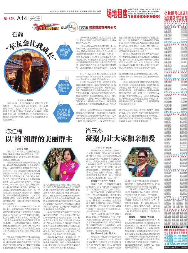 本报记者郭铭华 在我省,有一个由470多名私家车主组成的微信群——黑龙江宝骏560车友会。群主是典型的“80后”,姓名中有四个“石”字。人如其名,磊落实在,性情却是心思缜密、心地善良。在微信群创建不到一年的时间里,石磊就将车友会从群员之间的互相帮助,转型为关心关爱困难群体的公益团队。 A 挑选车型中“结缘”车友会 1987年出生的石磊,属兔,黑龙江宝骏560车友会微信群的群员们说他是一只细心开朗的“大兔子”。 “我是双城人,几年前来哈尔滨打工,从事I T行业,主要做网站运营、电子商务。”石磊坦言,随着女儿的出生,生活一点点的改善,一次偶然的机会他拥有了人生的第一台车,是一台哈飞的“民意”。车,成了石磊家里必不可少的出行工具。“东北是冰雪之城,到了冬天开车出门就感觉危险因素增高,后来我就有了打算换一台车的想法。”于是,在亲属和朋友们的帮衬下,石磊开始踏上了选车的“旅程”。石磊回忆说,记得刚开始看车的时候看中了五菱宝骏的730,七座,价格经济,但后来去店里试驾的时候,发现了宝骏560。“这让我很纠结,我开始在汽车之家注册账号,认识了很多网络上的朋友,也建立了一个QQ群,几位现在车友会的管理员就这样聚在了一起。” 就这样,黑龙江宝骏560车友会于2015年10月成立,并建立了同名微信群,且发展迅速。据石磊介绍,车友会从一开始的6位管理员变成如今的16位,从30几位车友一跃成700多人的QQ群,微信群认证车主已有470余人,全省各地分会也在逐步形成并完善。 B 组织车友资助白血病患儿 时至今日,无论黑龙江宝骏560车友会成员如何众多、队伍多么庞大,创会的宗旨——“不忘初衷、心怀感恩”仍始终如一。 3月29日,本报刊登的一则消息让石磊莫名的忧伤和感动。原来,就在当月27日,家住哈市平房区的康传宝给记者打去求助电话,称儿子康原浩突患急性髓系白血病M2型,正在哈尔滨市第一医院血液研究所进行治疗。经过多次治疗,家里的积蓄早已花光了,他在平房区建文头道街130号281楼附近拉起了“爱心摊位”,希望冰城的爱心人士能够搭把手,救救浩浩。“这件事对我触动很深,为人父母,我能体会到浩浩的爸爸妈妈沉重的心情。”在详细了解了一些情况后,石磊决定帮帮浩浩一家人。 很快,石磊就在微信群里把浩浩的事告诉了车友们,大家都说要捐款。经过车友们的共同努力,他们在汽车之家论坛发起了一次公益的捐款召集。这次募捐活动,不但为浩浩筹集到了治病的一部分费用,还让社会更多的人来关注、帮助有困难的人。石磊自豪地认为,最大的收获莫过于两位公益摄影师的加入和来自社会各界的鼎力相助,让一个看似简单的车队变得更有价值。 C “车友会让我成长,我以后要帮助更多的人” 采访中,每每提及车友会,石磊都能如数家珍般说起和车友们一路走来的点点滴滴。“每一次困难我们大家都一起从容面对,从一开始车友们有很多疑问、大家争先恐后地一个个解答,到后期形成了一个庞大的管理团队,建立了车友会独有的公众账号,整理了一系列的会规、分会、介绍等,都使我们不断的完善自己,强大自己,继续寻找那些需要帮助却没人发现的弱势群体,帮助他们走出困境。车友会让我成长,我以后要帮助更多的人。”