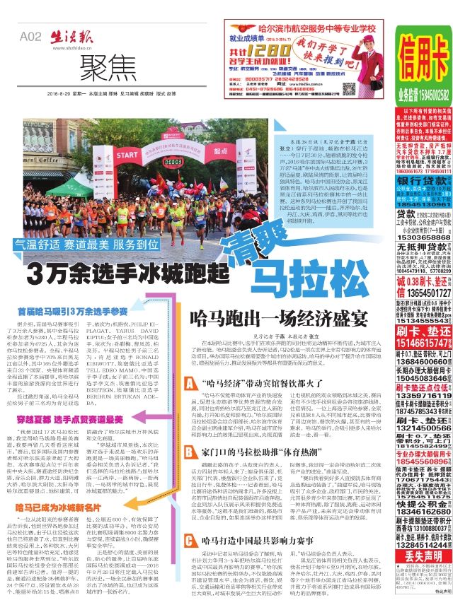 本报28日讯(见习记者于燕记者 张立)穿行于湿地、畅跑在松花江边……今日7时30分,随着清脆的发令枪声,2016哈尔滨国际马拉松正式开赛,3万名“马迷”在中央大街集结出发,26℃的舒适温度、欧陆风情的街景,让首届哈马独具特色。哈马由中国田径协会、黑龙江省体育局、哈尔滨市人民政府主办,也是黑龙江省系列马拉松赛其中的一站比赛。这种系列马拉松赛也开创了我国马拉松运动的先河——随后,齐齐哈尔、牡 丹江、大庆、鸡西、伊春、黑河等地市也将陆续开跑。 首届哈马吸引3万余选手参赛 据介绍,首届哈马赛事吸引了3万余人参赛,其中全程马拉松参加者为5280人,半程马拉松参加者为6725人,其余为迷你马拉松参赛者。全程、半程马拉松参赛选手中70%来自黑龙江省以外,其中165位外籍选手来自33个国家。央视体育频道全程直播了本届赛事,将哈尔滨丰富的旅游资源向全世界进行了展示。 经过激烈角逐,哈马全程马拉松男子前三名均为肯尼亚选手,依次为:机路农、PHI LI P KIPLAGAT、TARUS DAVI D KI PTUI;女子前三名均为中国选手,依次为:孙腊梅、曹凤英、柏亮芬。半程马拉松男子前三名为:肯尼亚选手RONALD KI BI WOTT、埃塞俄比亚选手TELL EDEO MAMO、中国选手李子成;女子前三名为:中国选手李文杰、埃塞俄比亚选手BI SETEGN、埃塞俄比亚选手BERI HUN BRTUKAN ADEBA。 穿越夏都选手点赞赛道最美 “我参加过17次马拉松比赛,我觉得哈马线路是最美赛道,我要再留几天看看这座城市。”赛后,很多国际及国内参赛者都对哈尔滨美景竖起了大拇指。本次赛事起点位于百年老街中央大街,赛道途经防洪纪念塔、音乐公园、群力大道、阳明滩大桥、哈尔滨大剧院、太阳岛等哈尔滨重要景点、地标建筑,可谓融合了哈尔滨城市万种风貌和文化底蕴。 “穿越城市风景线,本次比赛对选手来说是一场欢乐的奔跑更是一场美丽畅跑。”哈马组委会相关负责人告诉记者,“我们选择的马拉松线路凸显哈尔滨一江两岸、一路两桥、一街两院、一岛两带的城市特色,展现冰城夏都的魅力。” 哈马已成为冰城新名片 “一位从沈阳来的参赛者赛后告诉我,他到世界各地参加过马拉松比赛,出于以往经验这次他自己特意备了水,但直到比赛结束也没用上,各种饮水、大列巴等特色能量补给充足,他感觉哈马的服务非常到位。”哈尔滨国际马拉松组委会综合部部长曲建军告诉记者。值得一提的是,赛道沿途配备35辆救护车、24个医疗点,还设置饮水站28个、能量补给站15处、喷淋点8处、公厕近600个,有效保障了比赛的成功举办。哈市公安局在比赛现场调集8000名警力参与安保,连续奋战9小时,确保赛事安全举行。 正是舒心的温度、美丽的景色、贴心的服务,让首届哈尔滨国际马拉松圆满成功——2016年8月28日将注定载入马拉松的历史,一场全民参加的赛事展示出了冰城的美,也已成为这座城市的一张新名片。