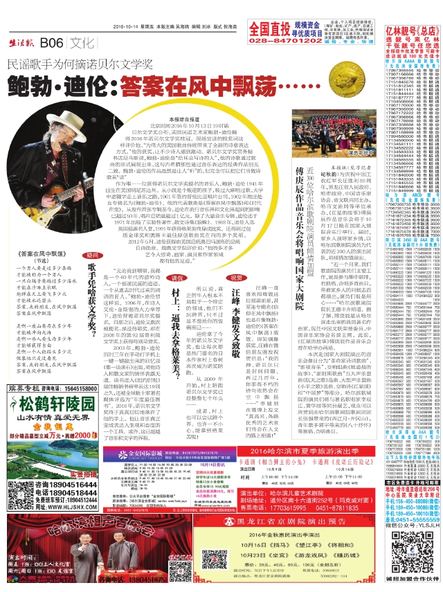 本报综合报道 北京时间2016年10月13日19时诺贝尔文学奖公布,美国民谣艺术家鲍勃·迪伦摘得2016年诺贝尔文学奖桂冠。现场宣读的授奖词这样评价他,“为伟大的美国歌曲传统带来了全新的诗意表达方式。”他的获奖,让不少诗人感到激动。诺贝尔文学奖常务秘书达尼乌斯说,鲍勃·迪伦是“给耳朵写诗的人”,他的诗歌通过歌曲的形式展现出来,这与古希腊那些通过音乐表达的经典作品别无二致。鲍勃·迪伦的作品虽然是让人“听”的,但完全可以把它们当做诗歌来“读”作为唯一一位获得诺贝尔文学奖提名的音乐人,鲍勃·迪伦1941年出生在美国明尼苏达州。从小就是个叛逆的孩子,吸过大麻唱过歌,大学中途辍学走上音乐之路,1961年签约哥伦比亚唱片公司,1962年推出处女专辑名为《鲍勃·迪伦》。他的代表歌曲是《答案在风中飘荡》和《时代在变》。从发布首张专辑至今,迪伦在流行音乐界和文化界起到的影响已超过50年,唱片总销量超过1亿元。除了大量音乐专辑,迪伦还于1971年出版了实验性著作、散文诗集《狼蛛》。1988年,迪伦入选美国摇滚名人堂,1991年获得格莱美终身成就奖。还得到过包括金球奖和奥斯卡最佳原创歌曲奖在内的多个奖项。 2012年5月,迪伦获得由美国总统奥巴马颁布的总统自由勋章。瑞典文学院评价说:“他的多才多艺令人惊奇,画家、演员和作家领域都有他的足迹。” 疑问 歌手凭啥获文学奖? “无论我到哪里,我都是一个60年代的游吟诗人,一个摇滚民谣的遗迹,一个从逝去时代过来的词语的匠人。”鲍勃·迪伦曾这样说。1996年,在诗人艾伦·金斯堡的大力举荐下,迪伦曾被诺贝尔奖提名。自那之后,迪伦又数次被提名,虽没得诺奖,却在2008年的第92届普利策文学奖上获得特别荣誉奖。 2003年,鲍勃·迪伦历时三年在手动打字机上一键一键敲出来的回忆录《像一块滚石》出版,将他诗人和散文家的情怀表露无遗。该书进入《纽约时报》最佳畅销书榜单长达19周之久,还被全球数十家著名媒体评选为“年度最佳图书”。2016年,诺贝尔文学奖终于真真切切地落在了他的手上。他让音乐真正变成表达人生观和态度的一个工具。或许,这已超越了音乐和文学的界限。 调侃 村上:逼我去拿格莱美? 所以说,真正的牛人根本不局限于一个特定的领域,他们不玩跨界,只不过是不想抢你的饭碗而已…… 迪伦拿了今年的诺贝尔文学奖,也让每次都是热门提名的日本作家村上春树再次成为诺奖陪跑。 从2009年开始,村上陪跑诺贝尔文学奖已经整整七个年头…… 或者,村上也可以尝试跨个界。也许一不小心,能拿到格莱美呢! 祝贺 汪峰李健发文致敬 汪峰一直喜欢和尊敬这位摇滚前辈,甚至连专辑名《信仰在风中飘扬》也是在像鲍勃·迪伦的《答案在风中飘荡》致敬。得知偶像获奖,汪峰在微信朋友圈发祝贺信息:“我的神,诺贝尔只是时间问题。再过几百年,你那些不朽的诗句依然会在空中飘扬……”李健则在微博上发文“真高兴,各路优秀的艺术家们终会在人文的路上相遇!” 《答案在风中飘荡》(节选) 一个男人要走过多少条路 才能被称为一个男人 一只白鸽子要越过多少海水 才能在沙滩上长眠 炮弹在天上要飞多少次 才能被永远禁止 答案,我的朋友,在风中飘荡 答案在风中飘荡 是啊一座山要存在多少年 才能被冲向大海 是啊一些人要生存多少年 才能够获得自由 是啊一个人能转头多少次 假装他只是没看见 答案,我的朋友,在风中飘荡 答案在风中飘荡