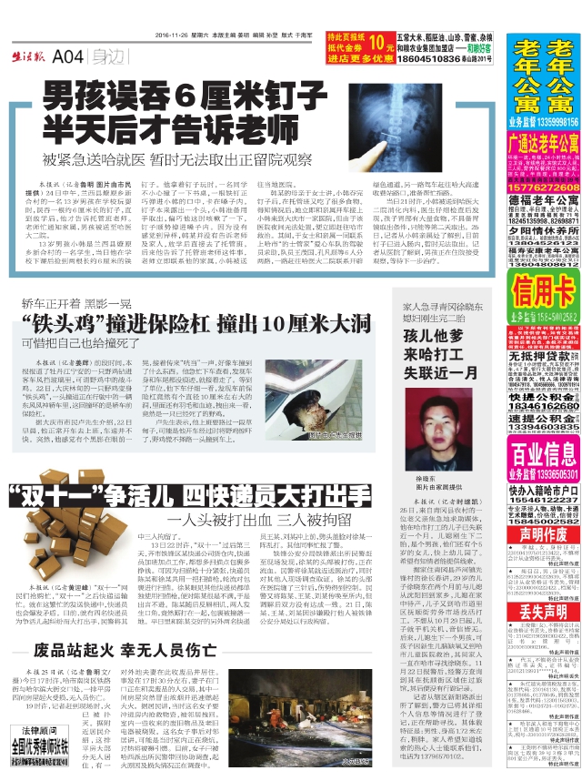 男孩误吞6厘米钉子半天后才告诉老师