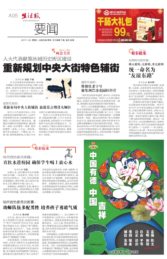 见习记者刘莹于燕 作为全国著名的旅游城市,哈尔滨有着悠久的历史和文化积淀,同样,历史建筑、旅游胜地的相关问题也逐渐突出。在哈市十五届人大一次会议上,来自不同区县的各代表团纷纷为哈尔滨的历史街区相关问题献计献策。 道里代表团: 重新布局中央大街辅街旅游景点增设女厕位 哈市人大代表栾芳表示,中央大街是哈尔滨的城市名片,众多中外游客慕名而来,但是辅街却没有规划,与主街形成了极大反差。她建议对辅街布局重新规划,建设酒吧一条街、东北餐饮一条街、俄罗斯餐饮一条街、工艺品一条街等,使中央大街成为一个集吃、住、行、游、购、娱的旅游胜地,打造以中央大街为主轴的欧陆风情展示街。 哈市人大代表焦宏伟告诉记者,说起如厕问题,让不少女性身心备受煎熬,原因就在于公共场所厕所中女性厕位的数量太少。为此,他提出了提高公厕女性厕位比例的建议,特别在旅游景区,能够尽快使公共厕所男女厕位比例达到1∶2标准。 道外代表团: 将餐饮老字号 聚集到巴洛克园区经营 “道外区有很多老建筑、老字号,非常具有民族特色和东北特色。”哈市人大代表马树升建议,对道外区所有的历史资源进行统一规划,围绕修旧如旧的思路进行保护和整合。 哈市人大代表霍源洲提出,中华巴洛克历史文化旅游景区头道街、二道街的餐饮美食一条街现在根本没有形成规模,有三分之二的房屋闲置,导致整个景区不能形成具有一定规模的美食一条街。建议由政府部门牵头协调好民居公司,重新进行招商,把所有饮食老字号品牌店都聚集在巴洛克园区进行经营。同时,建议政府成立中华巴洛克旅游项目机构,有专人负责对外联系旅游公司,确保旅游旺季道外区政府的旅游经济收入,同时也传播了老道外以及中华巴洛克的历史文化。