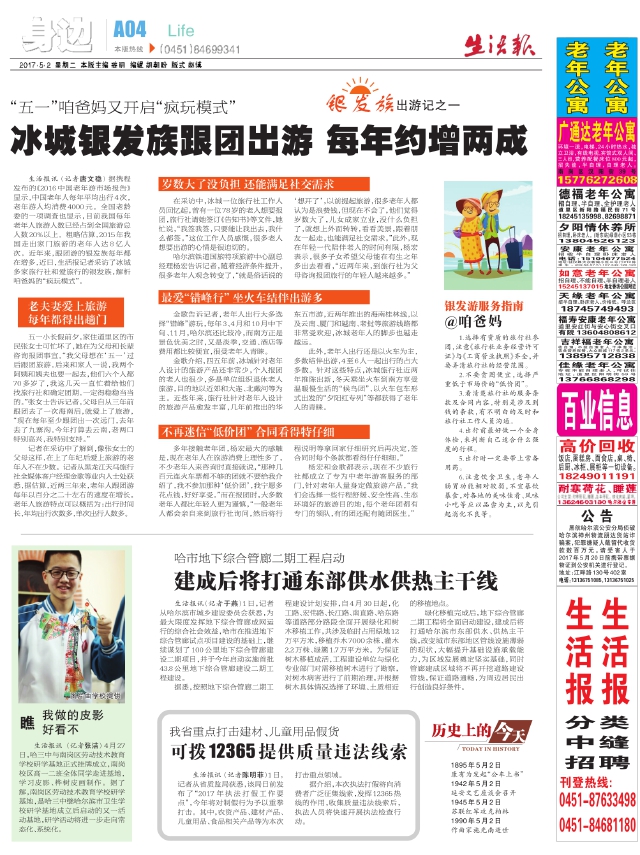 生活报讯(记者唐文稳)据携程发布的《2016中国老年游市场报告》显示,中国老年人每年平均出行4次,老年游人均消费4000元。全国老龄委的一项调査也显示,目前我国每年老年人旅游人数已经占到全国旅游总人数20%以上。粗略估算,2015年我国走出家门旅游的老年人达8亿人次。近年来,跟团游的银发族每年都在增多,近日,生活报记者采访了冰城多家旅行社和爱旅行的银发族,解析咱爸妈的“疯玩模式”。 老夫妻爱上旅游每年都得出趟门 五一小长假前夕,家住道里区的市民张女士可忙坏了,她在为父母和长辈咨询报团事宜。“我父母想在‘五一’过后跟团旅游,后来和家人一说,我两个阿姨和姨夫也要一起去,他们六个人都70多岁了,我这几天一直忙着给他们找旅行社和确定团期,一定得稳稳当当的。”张女士告诉记者,父母自从三年前跟团去了一次海南后,就爱上了旅游,“现在每年至少跟团出一次远门,去年去了九寨沟,今年打算去云南,老两口特别高兴,我特别支持。” 记者在采访中了解到,像张女士的父母这样,在上了年纪后爱上旅游的老年人不在少数。记者从黑龙江天马旅行社全媒体客户经理金歌等业内人士处获悉,据估算,近两三年来,老年人跟团游每年以百分之二十左右的速度在增长。老年人旅游特点可以概括为:出行时间长,年均出行次数多,单次出行人数多。 岁数大了没负担还能满足社交需求 在采访中,冰城一位旅行社工作人员回忆起,曾有一位78岁的老人想要报团,旅行社请她签订《告知书》等文件,她忙说,“我签我签,只要能让我出去,我什么都签。”这位工作人员感慨,很多老人想要出游的心情是很迫切的。 哈尔滨铁道国旅特项旅游中心副总经理杨宏告诉记者,随着经济条件提升,很多老年人观念转变了,“就是俗话说的‘想开了’,以前提起旅游,很多老年人都认为是浪费钱,但现在不会了,他们觉得岁数大了,儿女成家立业,没什么负担了,就想上外面转转,看看美景,跟着朋友一起走,也能满足社交需求。”此外,现在年轻一代陪伴老人的时间有限,杨宏表示,很多子女希望父母能在有生之年多出去看看,“近两年来,到旅行社为父母咨询报团旅行的年轻人越来越多。” 最爱“错峰行”坐火车结伴出游多 金歌告诉记者,老年人出行大多选择“错峰”游玩,每年3、4月和10月中下旬、11月,哈尔滨还比较冷,而南方正是景色优美之时,又是淡季,交通、酒店等费用都比较便宜,很受老年人青睐。 金歌介绍,四五年前,冰城针对老年人设计的旅游产品还非常少,个人报团的老人也很少,多是单位组织退休老人旅游,目的地以近郊和大连、北戴河等为主。近些年来,旅行社针对老年人设计的旅游产品愈发丰富,几年前推出的华东五市游,近两年推出的海南桂林线,以及云南、厦门和越南、老挝等旅游线路都非常受欢迎,冰城老年人的脚步也越走越远。 此外,老年人出行还是以火车为主,多数结伴出游,4至6人一起出行的占大多数。针对这些特点,冰城旅行社近两年推陈出新,冬天乘坐火车到南方享受温暖慢生活的“候鸟团”、以火车包车形式出发的“夕阳红专列”等都获得了老年人的青睐。 不再迷信“低价团”合同看得特仔细 多年接触老年团,杨宏最大的感触是,现在老年人在旅游消费上理性多了,不少老年人来咨询时直接就说,“那种几百元连火车票都不够的团就不要给我介绍了,我不参加那种‘低价团’,我宁愿多花点钱,好好享受。”而在报团时,大多数老年人都比年轻人更为谨慎,“一般老年人都会亲自来到旅行社询问,然后将行程说明等拿回家仔细研究后再决定,签合同时每个条款都看得仔仔细细。” 杨宏和金歌都表示,现在不少旅行社都成立了专为中老年游客服务的部门,针对老年人量身定做旅游产品,“我们会选择一些行程舒缓、安全性高、生态环境好的旅游目的地,每个老年团都有专门的领队,有的团还配有随团医生。” 银发游服务指南 @咱爸妈 1.选择有资质的旅行社参团,注意《旅行社业务经营许可证》与《工商营业执照》齐全,并要弄清旅行社的经营范围。 2.不要贪图便宜,选择严重低于市场价的“低价团”。 3.看清楚旅行社的服务条款及合同内容,特别是涉及到钱的条款,有不明白的及时和旅行社工作人员沟通。 4.出行前最好做一个全身体检,来判断自己适合什么强度的行程。 5.出行时一定要带上常备用药。 6.注意饮食卫生,老年人肠胃功能相对较弱,不宜暴饮暴食,对各地的美味佳肴、风味小吃等应以品尝为主,以免引起消化不良等。