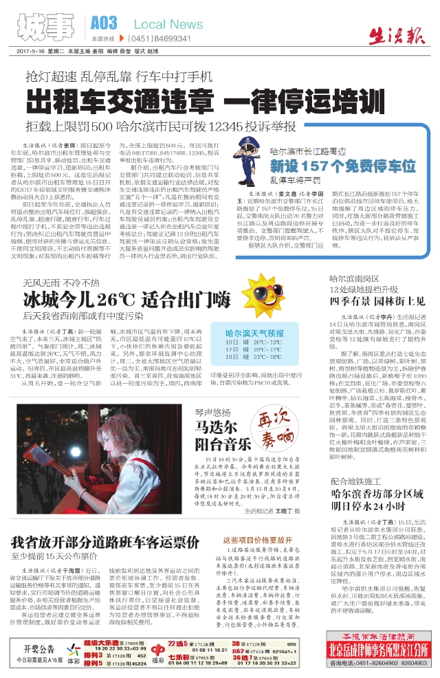 生活报讯(记者姜辉)即日起至今年年底,哈尔滨市出租车管理处将与交管部门信息共享、联动处罚,出租车交通违章,一律停运学习、重新培训;出租车拒载,上限处罚500元。这是生活报记者从哈尔滨市出租车管理处15日召开的《2017年迎创城文明服务暨交通秩序整治动员大会》上获悉的。 即日起至今年年底,交通执法人员将重点整治出租汽车闯红灯、强超强会、乱停乱靠、超速行驶,随意行车,行车过程中接打手机、不系安全带等违法违规行为;坚决纠正出租汽车驾驶员营运中吸烟、使用对讲机传播与营运无关信息、不使用文明用语、不主动给付票据等不文明现象;对发现的出租汽车拒载等行为,全部上限处罚500元。市民可拨打电话84517388、84517488、12345,投诉举报出租车违章行为。 据介绍,出租汽车行业考核部门与交管部门共同建立联动处罚、信息共享机制,依据交通运输行业法律法规,对发生交通违规违法的出租汽车驾驶员严格实施“五个一律”:凡是在整治期间有交通违章记录的一律停运学习、重新培训;凡是有交通违章记录的一律纳入出租汽车驾驶员诚信档案;出租汽车驾驶员交通违章一律记入所在出租汽车企业年度考核总分;驾驶证记满12分的出租汽车驾驶员一律依法注销从业资格;发生重大服务质量问题并造成恶劣影响的驾驶员一律列入行业黑名单,清出行业队伍。