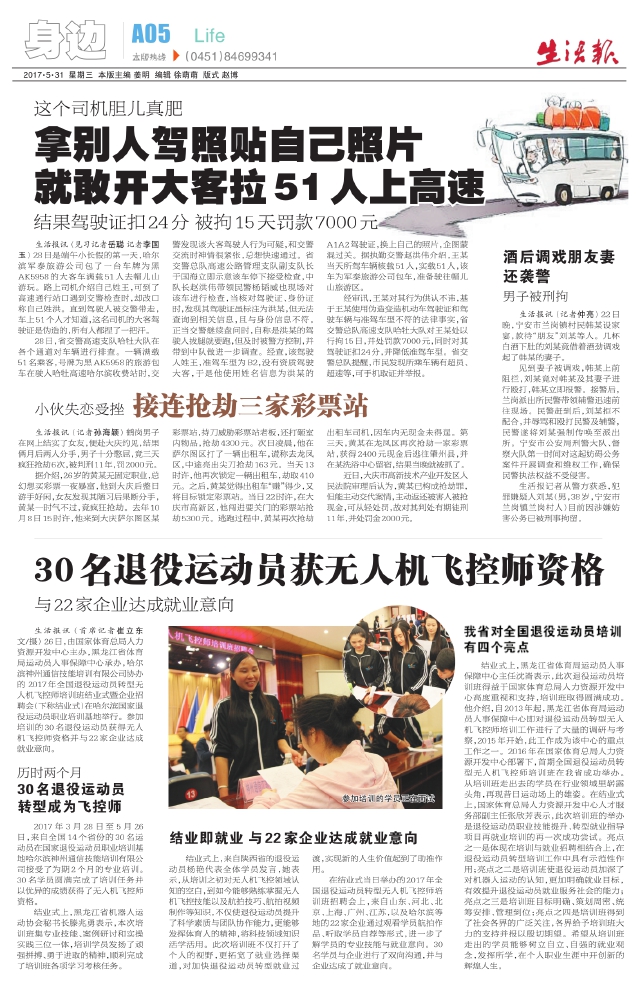 生活报讯(首席记者崔立东 文/摄)26日,由国家体育总局人力资源开发中心主办,黑龙江省体育局运动员人事保障中心承办,哈尔滨神州通信技能培训有限公司协办的2017年全国退役运动员转型无人机飞控师培训班结业式暨企业招聘会(下称结业式)在哈尔滨国家退役运动员职业培训基地举行。参加培训的30名退役运动员获得无人机飞控师资格并与22家企业达成就业意向。 历时两个月 30名退役运动员转型成为飞控师 2017年3月28日至5月26日,来自全国14个省份的30名运动员在国家退役运动员职业培训基地哈尔滨神州通信技能培训有限公司接受了为期2个月的专业培训。30名学员圆满完成了培训任务并以优异的成绩获得了无人机飞控师资格。 结业式上,黑龙江省机器人运动协会秘书长滕兆勇表示,本次培训班集专业技能、案例研讨和实操实践三位一体,培训学员发扬了顽强拼搏、勇于进取的精神,顺利完成了培训班各项学习考核任务。 结业即就业与22家企业达成就业意向 结业式上,来自陕西省的退役运动员杨艳代表全体学员发言,她表示,从培训之初对无人机飞控领域认知的空白,到如今能够熟练掌握无人机飞控技能以及航拍技巧、航拍视频制作等知识,不仅使退役运动员提升了科学素质与团队协作能力,更能够发挥体育人的精神,将科技领域知识活学活用。此次培训班不仅打开了个人的视野,更拓宽了就业选择渠道,对加快退役运动员转型就业过渡,实现新的人生价值起到了助推作用。 在结业式当日举办的2017年全国退役运动员转型无人机飞控师培训班招聘会上,来自山东、河北、北京、上海、广州、江苏,以及哈尔滨等地的22家企业通过观看学员航拍作品、听取学员自荐等形式,进一步了解学员的专业技能与就业意向。30名学员与企业进行了双向沟通,并与企业达成了就业意向。我省对全国退役运动员培训有四个亮点 结业式上,黑龙江省体育局运动员人事保障中心主任沈崙表示,此次退役运动员培训班得益于国家体育总局人力资源开发中心高度重视和支持,培训班取得圆满成功。他介绍,自2013年起,黑龙江省体育局运动员人事保障中心即对退役运动员转型无人机飞控师培训工作进行了大量的调研与考察,2015年开始,此工作成为该中心的重点工作之一。2016年在国家体育总局人力资源开发中心部署下,首期全国退役运动员转型无人机飞控师培训班在我省成功举办。从培训班走出去的学员在行业领域里崭露头角,再现昔日运动场上的雄姿。在结业式上,国家体育总局人力资源开发中心人才服务部副主任张欣芳表示,此次培训班的举办是退役运动员职业技能提升、转型就业指导项目再就业培训的再一次成功尝试。亮点之一是体现在培训与就业招聘相结合上,在退役运动员转型培训工作中具有示范性作用;亮点之二是培训班使退役运动员加深了对机器人运动的认知,更加明确就业目标,有效提升退役运动员就业服务社会的能力;亮点之三是培训班目标明确、策划周密、统筹安排、管理到位;亮点之四是培训班得到了社会各界的广泛关注,各界给予培训班大力的支持并报以殷切期望。希望从培训班走出的学员能够树立自立、自强的就业观念,发挥所学,在个人职业生涯中开创新的辉煌人生。