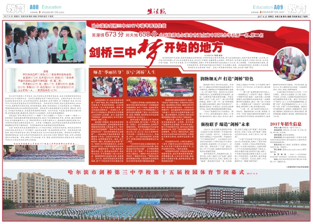 生活报记者宋菲张洁 成功的花由汗水浇灌,艰苦的挖掘流出甘甜的泉;辛劳的付出必有丰厚回报,紫气东来鸿运通天,孜孜不倦今朝梦圆!23日夜,对于哈尔滨市剑桥三中1300余名高考生来说,注定是个不眠夜,电脑屏幕上出现的一串串数字,似乎昭示着高中三年洒下的汗水,如今终于有了收获。多少个日日夜夜,多少个阴晴圆缺,剑桥三中师生相伴的时光远远超过了与父母、家人的相聚。只有深夜的孤灯奋战、夏日的涔涔汗水、老师们的辛勤付出才换回了今天的骄人成绩。这些成绩的背后,是剑桥三中全体教师用爱与专业书写的“奇迹”。这是一所梦想中的学校,今秋,我们在“剑桥”等你。喜报 热烈庆祝剑桥三中在2017年高考中喜传佳音! 吴漫琪673分、刘天旭658分,包揽2017年高考市重点高中以及民办学校第一名、第二名! 苏本朝632分、张一驰617分、王静609分、赵禹603分、李越601分、高志强601分,总分达到600分以上的有八人。一表进段率达40.3%! 哈尔滨市剑桥第三中学校是1996年经哈尔滨市教育局批准,由东方剑桥教育集团创办的现代化全日制国际中学。学校实行董事会领导下的校长负责制。全国名优校长、哈尔滨市民办教育协会秘书长、哈尔滨市政府督学、特级教师、省骨干教师、省“巾帼建功”标兵、哈尔滨市中小学学校设置委员会专家常翠萍任校长。学校办学实力雄厚,校舍总建筑面积达100000平方米,建有现代化的体育馆,馆内设有篮球、排球、形体训练室、乒乓球场地及42个钢琴房,有国家级标准的400米塑胶跑道运动场。学校设有六套标准的理化生实验室、微机室、语音室、多功能厅及阅览室,全校教学班皆配有多媒体。学生可住宿、可走读;宿舍实行公寓化管理;食堂物美价廉,服务优质;学校有100台通勤车,为学生提供通勤服务。 学校通过“学历(研究生学历)——教龄(三年以上教龄)——笔试——试讲——面试——校长面试”层层选拔的聘用机制和绩效考核,保证了学校拥有高水平的、专职的、稳定的教师队伍,其中特级教师五人,省、市级学科带头人及骨干教师56人,高级教师占教师总数的33%,中青年优秀教师占教师总数的65%。今年高一任课教师,由多年把关经验的毕业班教师和高薪诚聘的省市骨干教师担任。优秀的教师队伍为教育教学质量保驾护航。 本着“培养具有民族灵魂的国际化人才”的办学理念,经国家汉办批准,学校在美国弗吉尼亚州高木高中设立了“孔子课堂”,该校是我省唯一获此殊荣的民办中学。学校开设高中国际班,融合中外教育资源,融汇东西教学方法,全方位与国际教育接轨。国际班学生每年寒、暑假期间到美国、加拿大等合作学校插班学习,进行四至六周的“微留学”体验,为升入理想的国外大学做准备。同时,剑桥三中与新加坡、日本、韩国、泰国等国家的大学联合办学,该校高中毕业生可赴这些亚洲名牌大学就读。 师者“华丽转身”书写“剑桥”人生 如果说剑桥三中1300余名师生缔造了“剑桥”奇迹,那么可敬可爱的老师们就是这个奇迹的缔造者。正如《师说》所言:“古之学者必有师。师者,所以传道授业解惑也”。在剑桥三中,老师们不只传授知识,更向学生们传授着人生经验和人生智慧。如今,这些老师“华丽转身”,继续在剑桥三中书写着为师者的“剑桥”人生。 教室里干净整洁,学生们争先恐后地回答老师的提问,这种场景在英语老师籍晓刚的课堂上再普通不过。“哈尔滨市市级优秀教师”、“哈尔滨市香坊区优秀班主任”、“哈尔滨市香坊区记功教师”……在这些数不清的荣誉背后,是籍晓刚14年如一日的坚守和执着。籍晓刚说,老师要想给学生一碗水,自己就要有一桶水,而这桶水还必须是“活”水。“教师只有不断地更新知识,运用科学的教学方法,才能使课堂富有生机和活力”。籍晓刚每讲一门课,都会做大量的准备工作,查阅相关的资料,增加专业知识,牢牢掌握每个细小的知识点。籍晓刚曾带过多届毕业班,成绩喜人。2014年,他所带班级的高考英语成绩,创下了学校历年平均分最高分的纪录。 “注重语文学科核心素养的培养,将德育与语文教学有机结合”,怀揣着独到的教育理念,宋凡17年来一直走在语文教育的前列,他2013年所带领的高三六班学生李文超取得了语文130分的好成绩,武宸、李晨星、常宏等多名学生的语文成绩均在125分以上…… 被学生誉为“最美班主任”的刘科研,在学生眼里,他不仅是一个严师,更是一名慈父。在日常教学中,刘科研严格要求学生。其所带班级的平均分在学年内名列前茅,在三次省模拟考试中,分别以89.5分、92.3分、95.8分获得学年平均分第一,优秀率达40%以上,及格率100%。2017级刘铁武同学,在其指导下,获得全国高中数学联赛黑龙江省二等奖。 “化学学科与实际生活联系紧密,学生如果在生活中发现其中的关联,便会激发起对化学的兴趣”。化学教师杨婷婷坚信:只有了解每一个学生的思想状况和心理特点,了解每个学生成长的不同经历,了解他们的过去,了解他们的家庭和周围的环境,才能选择和运用恰当的方法和手段来进行最有效的教育。 物理教师王树友在教学中,创建了“四到位”的教学模式:即教材知识回归到位、善变模型分析到位、解答过程书写到位、得分意识强化到位。王树友在日常教学中一直注重培养学生自我探究学习的能力,强化学生逻辑思维能力训练。通过物