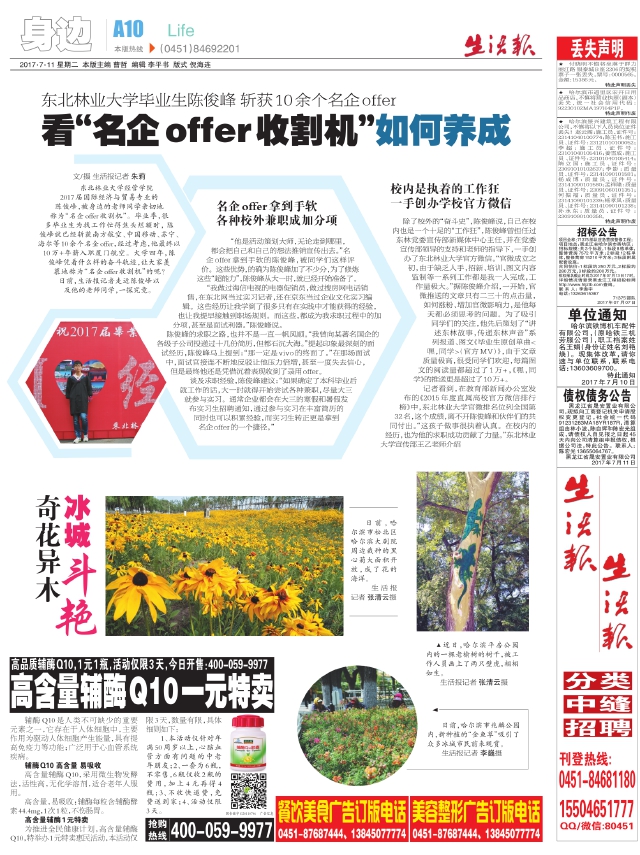 文/摄生活报记者朱莉 东北林业大学经管学院2017届国际经济与贸易专业的陈俊峰,被身边的老师同学亲切地称为“名企offer收割机”。毕业季,很多毕业生为找工作忙得焦头烂额时,陈俊峰就已经斩获南方航空、中国移动、苏宁、海尔等10余个名企of fer,经过考虑,他最终以10万+年薪入职厦门航空。大学四年,陈俊峰凭着什么样的奋斗轨迹,让大家羡慕地称为“名企offer收割机”的呢?日前,生活报记者走近陈俊峰以及他的老师同学,一探究竟。 名企offer拿到手软 各种校外兼职成加分项 “他是活动策划大师,无论走到哪里, 都会把自己和自己的想法推销宣传出去。”名企of fer拿到手软的陈俊峰,被同学们这样评价。这些优势,的确为陈俊峰加了不少分,为了修炼这些“超能力”,陈俊峰从大一时,就已经开始准备了。“我做过海信电视的电器促销员,做过搜房网电话销售,在东北网当过实习记者,还在京东当过企业文化实习编辑。这些经历让我学到了很多只有在实践中才能获得的经验,也让我提早接触到职场规则。而这些,都成为我求职过程中的加分项,甚至是面试利器。”陈俊峰说。 陈俊峰的求职之路,也并不是一直一帆风顺。“我曾向某著名国企的各级子公司投递过十几份简历,但都石沉大海。”提起印象最深刻的面试经历,陈俊峰马上提到:“那一定是vivo的终面了。”在那场面试中,面试官接连不断地反驳让他压力倍增,甚至一度失去信心,但是最终他还是凭借沉着表现收到了录用offer。 谈及求职经验,陈俊峰建议:“如果确定了本科毕业后就工作的话,大一时就得开始尝试各种兼职,尽量大三就参与实习。通常企业都会在大三的寒假和暑假发布实习生招聘通知,通过参与实习在丰富简历的同时也可以积累经验,而实习生转正更是拿到名企offer的一个捷径。” 校内是执着的工作狂一手创办学校官方微信 除了校外的“奋斗史”,陈俊峰说,自己在校内也是一个十足的“工作狂”,陈俊峰曾担任过东林党委宣传部新媒体中心主任,并在党委宣传部领导的支持和老师的指导下,一手创办了东北林业大学官方微信。“官微成立之初,由于缺乏人手,招新、培训、图文内容监制等一系列工作都是我一人完成,工作量极大。”据陈俊峰介绍,一开始,官微推送的文章只有二三十的点击量,如何涨粉、增加官微影响力,是他每天都必须思考的问题。为了吸引同学们的关注,他先后策划了“讲述东林故事,传递东林声音”系列报道、图文《毕业生原创单曲<嘿,同学>(官方MV)》,由于文章质量极高,很受同学们欢迎,每篇图文的阅读量都超过了1万+,《嘿,同学》的推送更是超过了10万+。记者看到,在教育部新闻办公室发布的《2015年度直属高校官方微信排行榜》中,东北林业大学官微排名位列全国第32名,这个成绩,离不开陈俊峰和伙伴们的共同付出。“这孩子做事很执着认真。在校内的经历,也为他的求职成功贡献了力量。”东北林业大学宣传部王乙老师介绍