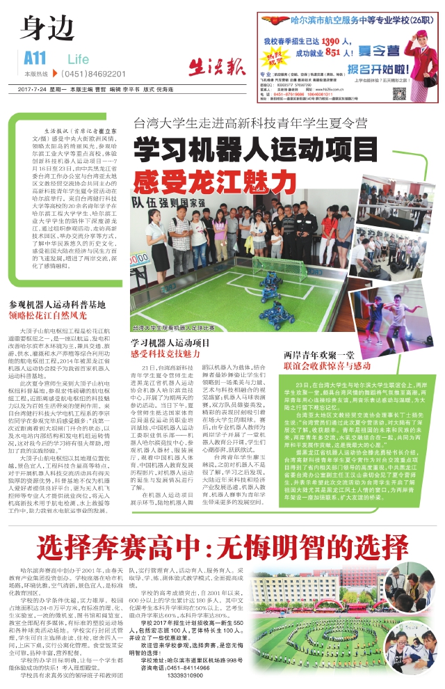 生活报讯(首席记者崔立东 文/摄)感受中央大街欧洲风情,领略太阳岛的绮丽风光,参观哈尔滨工业大学等重点高校,体验创新科技机器人运动项目……7月16日至23日,由中共黑龙江省委台湾工作办公室与台湾亚太地区文教经贸交流协会共同主办的高新科技青年学生夏令营活动在哈尔滨举行。来自台湾健行科技大学等高校的20余名青年学子在哈尔滨工程大学学生、哈尔滨工业大学学生的陪伴下深度游龙江,通过组织参观活动、走访高新技术园区、举办交流分享等方式,了解中华民族悠久的历史文化,感受祖国大陆在经济与民生方面的飞速发展,增进了两岸交流,深化了感情融和。参观机器人运动科普基地领略松花江自然风光 大顶子山航电枢纽工程是松花江航道重要枢纽之一,是一座以航运、发电和改善哈尔滨市水环境为主,兼具交通、旅游、供水、灌溉和水产养殖等综合利用功能的航电枢纽工程,2014年被黑龙江省机器人运动协会授予为我省首家机器人运动科普基地。 此次夏令营师生来到大顶子山杭电枢纽科普基地,参观宏伟磅礴的航电枢纽工程,近距离感受航电枢纽的科技魅力以及为百姓生活带来的便利作用。来自台湾健行科技大学电机工程系的李宗佑同学在参观完毕后感受颇多:“我第一次近距离看到大坝闸门开合的状态,以及水电站内部结构和发电机组运转情况,这对我今后的学习将有很大帮助,增加了我的实践经验。” 大顶子山航电枢纽以其地理位置优越,景色宜人,工程科技含量高等特点,对于开展机器人科技交流活动具有得天独厚的资源优势,科普基地不仅为机器人爱好者提供良好平台,更为无人机飞控师等专业人才提供就业岗位,将无人机高新技术用于航电检测、水上救援等工作中,助力我省水电航运事业的发展。 学习机器人运动项目感受科技竞技魅力 21日,台湾高新科技青年学生夏令营师生走进黑龙江省机器人运动协会机器人哈尔滨竞技中心,开展了为期两天的参访活动。当日下午,夏令营师生抵达国家体育总局退役运动员职业培训基地、中国机器人运动工委职业俱乐部——机器人哈尔滨竞技中心,参观机器人器材、服装展厅,观看中国机器人体育、中国机器人教育发展历程影片,对机器人运动的诞生与发展情况进行了解。 在机器人运动项目展示环节,陆地机器人舞蹈以机器人为载体,结合舞者曼妙舞姿让学生们领略到一场柔美与力量、艺术与科技相融合的视觉盛宴;机器人马球表演赛,双方队员雄姿英发,精彩的表现时刻吸引着在场大学生的眼球。赛后,由专业机器人教师为两岸学子开展了一堂机器人教育公开课,学生们心潮澎湃,跃跃欲试。 台湾青年学生廖玉琳说,之前对机器人不是很了解,学习之后发现,大陆近年来科技和经济产业发展迅速,机器人教育、机器人赛事为青年学生带来更多的发展空间。 两岸青年欢聚一堂 联谊会收获惊喜与感动 23日,在台湾大学生与哈尔滨大学生联谊会上,两岸学生欢聚一堂,颇具台湾风情的舞蹈将气氛推至高潮,两岸青年用心连接珍贵友谊,用音乐表达感动与温暖,为大陆之行留下难忘记忆。 台湾亚太地区文教经贸交流协会理事长丁士扬先生说:“台湾营员们通过此次夏令营活动,对大陆有了深层次了解,收获颇丰。青年是祖国的未来和民族的未来,两岸青年多交流,水乳交融结合在一起,共同为两岸和平发展作贡献,这是我最大的心愿。” 据黑龙江省机器人运动协会滕兆勇秘书长介绍,台湾高新科技青年学生夏令营作为对台交流重点项目得到了省内相关部门领导的高度重视,中共黑龙江省委台湾办公室副主任王汉山亲切会见了夏令营师生,并表示希望此次交流活动为台湾学生开启了解祖国大陆尤其是黑龙江风土人情的窗口,为两岸青年架设一座加强联系、扩大友谊的桥梁。