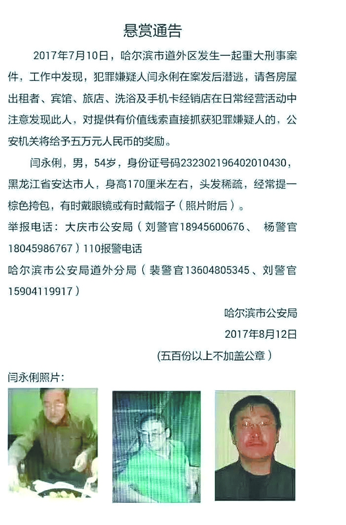 生活报讯(记者李威兵)13日,生活报记者从哈尔滨市道外公安分局获悉,7月10日,道外区发生一起重大刑事案件。经初步侦查,作案嫌疑人为安达市男子闫永俐,此人作案后潜逃。道外警方表示,现已对闫某进行通缉,市民若对警方提供有价值线索,公安机关将奖励五万元人民币。 闫永俐,男,身高约170厘米,年龄54岁。头发稀疏,有时会戴眼镜。希望掌握有价值线索的市民尽快与警方联系。 联系人:大庆市公安局刘警官18945600676杨警官18045986767 哈尔滨市道外分局裴警官13604805345刘警官15904119917