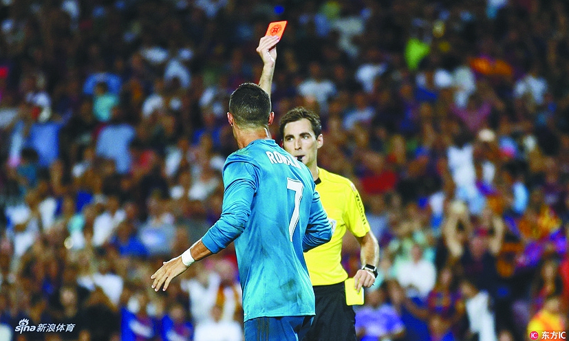 生活报讯(矫凌)在北京时间14日凌晨进行的西班牙超级杯首回合比赛中,皇马客场3比1战胜巴萨。不过为皇马打进1球的C罗不但吃到红牌,还可能被禁赛数场。 C罗在比赛下半时替补出战,并于第80分钟打入一球,进球后他脱衣庆祝,吃到黄牌。两分钟后他被判假摔,吃的第二张黄牌被罚下。C罗对这一判罚极为不满,伸手推了当值主裁一把,这一举动被记录了下来。 根据西班牙足协的相关规定,C罗推搡裁判的举动或将使其遭受4至12场禁赛的追加处罚。西班牙马卡报认为,C罗极有可能在联赛中被追加禁赛。