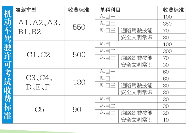 生活报讯(记者袁成亮)28日,生活报记者从省政府获悉,省物价监督管理局、省财政厅联合发布《关于重新核定全省机动车驾驶许可考试收费标准及有关问题的通知》。生活报记者从省物价监督管理局了解到,这次收费标准的重新核定包括:考试费下调、部分考试科目整合两大变化。 违章驾驶员单科考试按最高准驾车型收费 《通知》明确了收费主体,机动车驾驶许可考试费由有关公安交通管理部门收取。收费范围包括:初次申请或增驾考试、军队驾驶证转地方考试、境外驾驶证换证考试、特殊情形驾驶许可考试。在收费标准方面,机动车驾驶许可考试应按照机动车准驾车型及代号对应的收费标准收取考试费用。只进行单科考试的,按单科考试收费标准收取考试费。根据规定需要对违章驾驶员进行单科考试的,可按驾驶证记载的最高准驾车型收取考试费。 考试未合格每科免费补考一次 为减轻机动车驾驶许可考试申请人的负担,对参加考试未合格的人员,每个科目可以免费补考一次;对于免费补考仍不合格的申请人在有效期内重新申请考试的,参加任何一科考试,每科均按现行考试收费标准的50%收取补考费用。但对参加特殊情形驾驶许可考试未合格的人员不予减免补考费用。 调整收费标准后,A1、A2、A3、B1、B2车型驾驶许可考试收费收入,市(地、农垦)分成额为450元,省分成额为100元。该分成政策执行至2018年8月31日。 C5证残疾人专用车考试费降60元 生活报记者从省物价监督管理局获悉,《通知》公布的标准,较之前的标准有如下新变化:首先,A1、A2、A3、B1、B2车型考试,收费标准从原来的560元降至550元;C3、C4、D、E、F车型的收费标准分别从380元至180元统一调整至180元;C5车型的收费标准从150元降至90元。另外,《通知》公布的标准,还将之前过细的考试科目进行了整合,科目二的A、B不再分开,统一为科目二。 各收费单位不得擅自设立收费项目 各收费单位要认真贯彻执行各项收费政策,不得擅自设立收费项目或调整收费标准。收费时使用省财政厅统一印制的非税收入票据,并自觉接受价格、财政、审计部门的监督检查。 此通知自发文之日(2017年8月20日)起执行至2022年8月31日。《黑龙江省物价监督管理局黑龙江省财政厅关于全省机动车驾驶许可考试收费标准及有关问题的批复》(黑价联〔2015〕3号)同时废止。