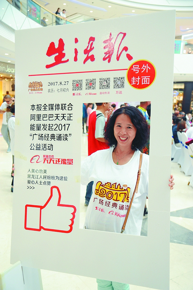 生活报讯(实习生王思月记者李丹)17日起,生活报联合阿里天天正能量共同举办的“2017广场经典诵读”活动正式启动,今年广场经典诵读的主题是“读经典,分享爱”。海选阶段,共有43个朗诵作品的朗诵者报名参与活动,经过初步筛选,有16个比赛作品进入海选赛。经过27日在哈西万达广场海选赛的激烈角逐,最终有10个参赛作品晋级。现场,近500位读者参与生活报异形展板合影、扫码等多项互动,领取到活动奖品。 27日,在哈西万达广场海选赛现场,曾演播小说百余部、入选《黑龙江文化艺术名人录》的陈兵老师作为评委及朗诵嘉宾,一首《沁园春·雪》拉开了海选赛的大幕。近500名读者见证了“2017广场经典诵读”海选赛,16个海选参赛作品同台竞争,最终有10个节目晋级。在众多参赛者中,今年66岁的朗诵者余涛朗诵的《河床》赢得了最多的掌声。赵邵然今年刚满5周岁,是此次比赛中年龄最小的参赛选手。圆圆的寸头,红红的脸蛋儿,专注表演丝毫不惧场,“我喜欢朗诵,不管是跟妈妈一起表演,还是自己独自朗诵,我都会争取每次都进步一些。” 现场设置的许多互动环节也得到读者的积极参与,读者通过扫描包括生活报、阿里天天正能量等官微二维码,获赠了精美的纪念品,在“生活报号外”异形板前合影留念,并转发朋友圈,获赠活动纪念章一枚。本次活动吸引了多行业读者的参与,朗诵作品有名家名篇、有经典诗词、更有现代诗歌。据了解,伴随着“2017广场经典诵读”活动的启动,长春、青岛、哈尔滨等十余城市同步启动“全民诵读月”,任何人都可以通过手机讲述你的故事,录下最能代表心意的经典作品,送给你爱的人。9月上旬,通过海选赛的选手将登上龙江赛区决赛舞台,届时将邀请更多的朗诵嘉宾,为读者带来视觉、听觉的饕餮盛宴。为爱发声,我们在这里等您! 参与读者合影图片均由生活报记者李巍摄 扫码领奖 留念