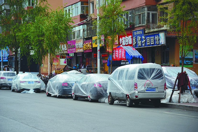 30日,在哈尔滨道里区大民兴街上,道路两旁的上百辆车被人用塑料袋套上,为防止塑料袋被风刮跑,还被人用绳子绑在轮毂上,很是奇怪。经记者了解,原来是附近街路楼顶正在做保暖防水施工,需要打发泡胶,因近日是大风天气,为了防止发泡胶乱飞,导致楼下的车辆受损,施工人员才准备了上千个塑料袋,对楼下的车辆进行“封存”保护。 生活报记者张宇驰摄