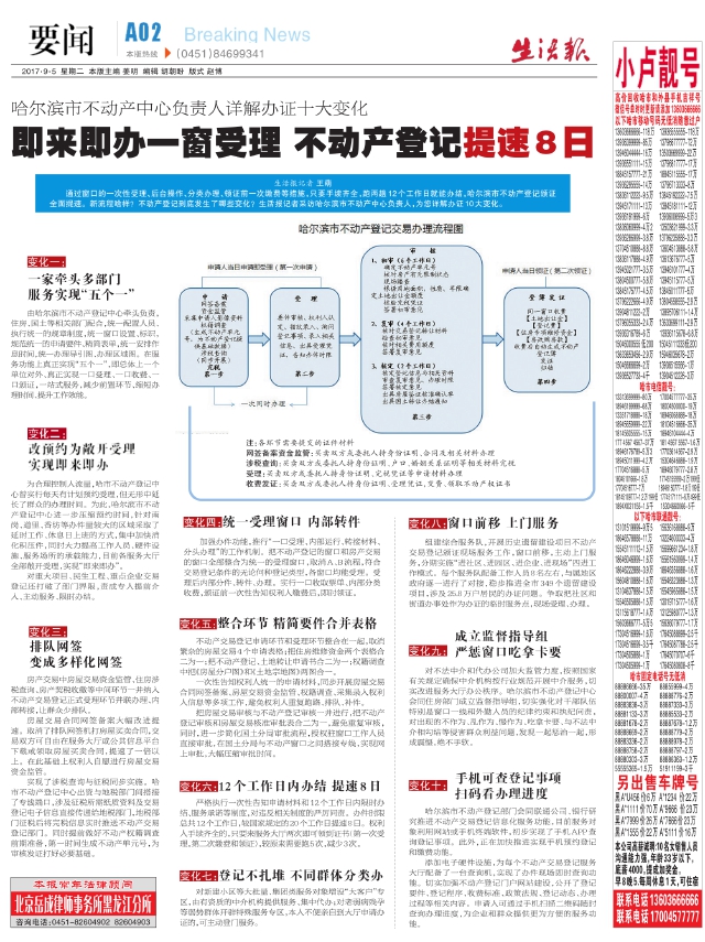 生活报记者王萌 通过窗口的一次性受理、后台操作、分类办理、领证前一次缴费等措施,只要手续齐全,跑两趟12个工作日就能办结,哈尔滨市不动产登记颁证全面提速。新流程啥样?不动产登记到底发生了哪些变化?生活报记者采访哈尔滨市不动产中心负责人,为您详解办证10大变化。 变化一: 一家牵头多部门服务实现“五个一” 由哈尔滨市不动产登记中心牵头负责,住房、国土等相关部门配合,统一配置人员、执行统一的规章制度,统一窗口设置、标识,规范统一的申请要件、精简表单,统一安排作息时间,统一办理导引图、办理区域图。在服务功能上真正实现“五个一”,即总体上一个单位对外、真正实现一口受理、一口收费、一口颁证,一站式服务,减少前置环节、缩短办理时间、提升工作效能。 变化二: 改预约为敞开受理实现即来即办 为合理控制人流量,哈市不动产登记中心曾实行每天有计划预约受理,但无形中延长了群众的办理时间。为此,哈尔滨市不动产登记中心进一步压缩预约时间,针对南岗、道里、香坊等办件量较大的区域采取了延时工作、休息日上班的方式,集中加快消化积压件,同时大力提高工作人员、硬件设施、服务场所的承载能力,目前各服务大厅全部敞开受理,实现“即来即办”。 对重大项目、民生工程、重点企业交易登记还打破了部门界限,责成专人提前介入、主动服务、限时办结。 变化三: 排队网签 变成多样化网签 房产交易中房屋交易资金监管、住房涉税查询、房产契税收缴等中间环节一并纳入不动产交易登记正式受理环节并联办理、内部转接,让群众少排队。 房屋交易合同网签备案大幅改进提速。取消了排队网签机打房屋买卖合同,交易双方可自由在服务大厅或公共信息平台下载或领取房屋买卖合同,提速了一倍以上。在此基础上权利人自愿进行房屋交易资金监管。 实现了涉税查询与征税同步实施。哈市不动产登记中心出资与地税部门间搭接了专线端口,涉及征税所需纸质资料及交易登记电子信息直接传递给地税部门,地税部门征税后将完税信息实时推送不动产交易登记部门。同时提前做好不动产权籍调查前期准备,第一时间生成不动产单元号,为审核发证打好必要基础。 变化四:统一受理窗口内部转件 加强办件功能,推行“一口受理、内部运行、转接材料、分头办理”的工作机制。把不动产登记的窗口和房产交易的窗口全部整合为统一的受理窗口,取消A、B流程,符合交易登记条件的无论何种登记类型,各窗口均能受理。受理后内部分件、转件、办理。实行一口收取票单、内部分类收费,颁证前一次性告知权利人缴费后,即时领证。 变化五:整合环节精简要件合并表格 不动产交易登记申请环节和受理环节整合在一起,取消繁杂的房屋交易4个申请表格;把住房维修资金两个表格合二为一;把不动产登记、土地转让申请书合二为一;权籍调查中把《房屋分户图》和《土地宗地图》两图合一。 一次性告知权利人统一的申请材料,同步开展房屋交易合同网签备案、房屋交易资金监管、权籍调查、采集录入权利人信息等多项工作,避免权利人重复跑路、排队、补件。 把房屋交易审核与不动产登记审核一并进行,把不动产登记审核和房屋交易核准审批表合二为一,避免重复审核,同时,进一步简化国土分局审批流程,授权驻窗口工作人员直接审批,在国土分局与不动产窗口之间搭接专线,实现网上审批,大幅压缩审批时间。 变化六:12个工作日内办结提速8日 严格执行一次性告知申请材料和12个工作日内限时办结、服务承诺等制度,对违反相关制度的严厉问责。办件时限总共12个工作日,较国家规定的20个工作日提速8日。权利人手续齐全的,只要来服务大厅两次即可领到证书(第一次受理,第二次缴费和领证),较原来需要跑5次,减少3次。 变化七:登记不扎堆不同群体分类办 对新建小区等大批量、集团类服务对象增设“大客户”专区,由有资质的中介机构提供服务、集中代办;对老弱病残孕等弱势群体开辟特殊服务专区,本人不便亲自到大厅申请办证的,可主动登门服务。 变化八:窗口前移上门服务 组建综合服务队,开展历史遗留建设项目不动产交易登记颁证现场服务工作,窗口前移,主动上门服务,分期实施“进社区、进园区、进企业、进现场”四进工作模式。每个服务队配备工作人员8名左右,与属地区政府逐一进行了对接,稳步推进全市349个遗留建设项目,涉及25.8万户居民的办证问题。争取把社区和街道办事处作为办证的临时服务点,现场受理、办理。 变化九: 成立监督指导组严惩窗口吃拿卡要 对不法中介和代办公司加大监管力度,按照国家有关规定确保中介机构按行业规范开展中介服务,切实改进服务大厅办公秩序。哈尔滨市不动产登记中心会同住房部门成立监督指导组,切实强化对干部队伍特别是窗口一线和外勤人员的纪律约束和执纪问责,对出现的不作为、乱作为、慢作为、吃拿卡要、与不法中介相勾结等侵害群众利益问题,发现一起惩治一起,形成震慑,绝不手软。 变化十: 手机可查登记事项扫码看办理进度 哈尔滨市不动产登记部门会同联通公司、银行研究推进不动产交易登记信息化服务功能,目前服务对象利用网站或手机终端软件,初步实现了手机APP查询登记事项。此外,正在加快推进实现手机预约登记和缴费功能。 添