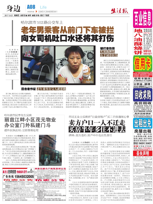 老年男乘客从前门下车被拦向女司机吐口水还将其打伤