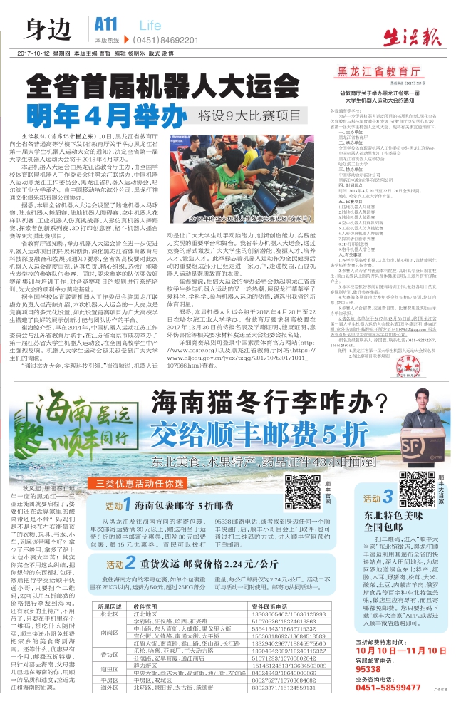 生活报讯(首席记者崔立东)10日,黑龙江省教育厅向全省各普通高等学校下发《省教育厅关于举办黑龙江省第一届大学生机器人运动大会的通知》,决定全省第一届大学生机器人运动大会将于2018年4月举办。 本届机器人大运会由黑龙江省教育厅主办,由全国学校体育联盟机器人工作委员会驻黑龙江联络办、中国机器人运动黑龙江工作委员会、黑龙江省机器人运动协会、哈尔滨工业大学承办。由中国移动哈尔滨分公司、黑龙江神通文化俱乐部有限公司协办。 据悉,本届全省机器人大运会设置了陆地机器人马球赛、陆地机器人舞蹈赛、陆地机器人障碍赛、空中机器人花样队列赛、工业机器人仿真挑战赛、人形仿真机器人舞蹈赛、探索者创新系列赛、3D打印创意赛、格斗机器人擂台赛等9大项比赛项目。 省教育厅通知称,举办机器人大运会旨在进一步促进机器人运动项目的拓展和创新,深化黑龙江省体育教育与科技深度融合和发展。《通知》要求,全省各高校要对此次机器人大运会高度重视、认真负责、精心组织,选拔出能够代表学校的参赛队伍参赛。同时,要求参赛的队伍要做好赛前集训与培训工作,对各竞赛项目的规则进行系统培训,为大会的顺利举办奠定基础。 据全国学校体育联盟机器人工作委员会驻黑龙江联络办负责人崔海鲸介绍,本次机器人大运会的一大亮点是竞赛项目的多元化设置,如此设置竞赛项目为广大高校学生搭建了良好的展示创新才能与团队协作的平台。 崔海鲸介绍,早在2014年,中国机器人运动江苏工作委员会与江苏省教育厅联手,在江苏省南京市成功举办了第一届江苏省大学生机器人运动会,在全国高校学生中产生强烈反响。机器人大学生运动会越来越受到广大大学生们的青睐。 “通过举办大会,实现科技引领。”崔海鲸说,机器人运动是让广大大学生动手动脑能力、创新创造能力、实践能力实现的重要平台和舞台。我省举办机器人大运会,通过竞赛的形式激发广大大学生的创新潜能、发掘人才、培养人才、锻造人才。此举标志着机器人运动作为全民健身活动的重要组成部分已经走进千家万户,走进校园,凸显机器人运动是素质教育的本质。 崔海鲸说,相信大运会的举办必将会掀起黑龙江省高校学生参与机器人运动的又一轮热潮,展现龙江莘莘学子爱科学、学科学、参与机器人运动的热情,遴选出我省的新体育明星。 据悉,本届机器人大运会将于2018年4月20日至22日在哈尔滨工业大学举办。省教育厅要求各高校要在2017年12月30日前将报名表及学籍证明、健康证明、意外伤害险等相关要求材料发送至大会组委会报名处。 详细竞赛规则可登录中国素质体育官方网站(ht t p://www.cssr c.or g)以及黑龙江省教育厅网站(ht t ps:// www.hl j edu.gov.cn/j yzx/t zgg/201710/t 20171011_ 107966.ht m)查看。 省教育厅关于举办黑龙江省第一届 大学生机器人运动大会的通知 各普通高等学校: 为进一步促进机器人运动项目的拓展和创新,深化全省体育教育与科技深度融合和发展,省教育厅决定举办黑龙江省第一届大学生机器人运动大会。现将有关事宜通知如下: 一、主办单位 黑龙江省教育厅 二、承办单位 全国学校体育联盟机器人工作委员会驻黑龙江联络办 中国机器人运动黑龙江工作委员会 黑龙江省机器人运动协会 哈尔滨工业大学 三、协办单位 中国移动哈尔滨分公司 黑龙江神通文化俱乐部有限公司 四、时间地点 时间:2018年4月20日至22日,20日全天报到。 地点:哈尔滨工业大学体育馆。五、比赛项目 1.陆地机器人马球赛 2.陆地机器人舞蹈赛 3.陆地机器人障碍赛 4.空中机器人花样队列赛 5.工业机器人仿真挑战赛 6.人形仿真机器人舞蹈赛 7.探索者创新系列赛 8.3D打印创意赛 9.格斗机器人擂台赛 六、有关事项 1.各学校要高度重视、认真负责、精心组织,选拔能够代表学校的参赛队伍参赛。 2.参赛人员为省内普通本科院校、高职高专全日制在校生,须由县级以上医院开具身体健康证明,且意外伤害保险齐全。 3.各学校要抓好赛前训练和培训工作,做好各项目的竞赛规则培训,做好参赛准备。 4.大赛筹备期间由大赛组委会组织相应培训,培训自愿,费用自理。 5.参赛人员食宿费、交通费自理。比赛费用及奖励由承办单位承担。 6.请各地、各单位于2017年12月30日前,将《黑龙江省第一届大学生机器人运动大会报名表》及学籍证明、健康证明、意外伤害险扫描件电子版发至541089612@qq.com,报名表须有报名单位主管领导签字并加盖公章。 报名及报到联系人:徐国鑫,联系电话:0451-82292297、18646236965。 附件:1.黑龙江省第一届大学生机器人运动大会报名表 2.各比赛项目竞赛规则 2017年哈工大机器人挑战赛比赛现场(资料片)