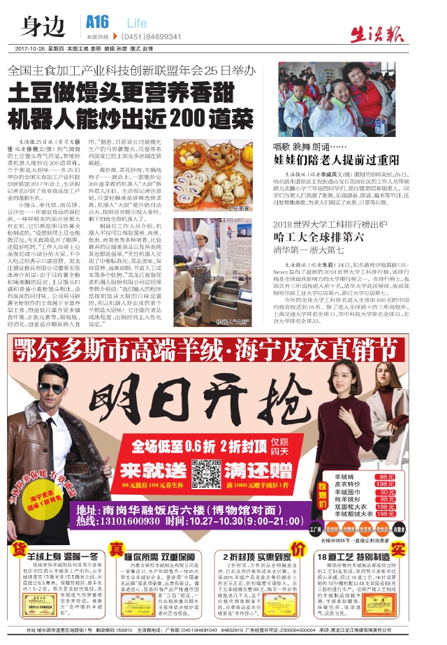 生活报25日讯(实习生徐佳记者徐楠文/摄)热气腾腾的土豆馒头香气四溢,智能炒菜机器人能炒近200道菜肴,个个都是大厨味……在25日举办的全国主食加工产业科技创新联盟2017年会上,生活报记者见识到了我省食品加工产业的蓬勃生机。 小馒头、枣花糕、南瓜饼、豆沙包……在德业食品的展位前,一样样精美的面点里都大有玄机,它们都是用马铃薯全粉制成的。“没想到用土豆也能做豆包,今天真算是开了眼界,还挺好吃的。”工作人员将土豆面食切成小块分给大家,不少人吃过后表示口感很赞。黑龙江德业食品有限公司董事长张泳涛介绍说:由于马铃薯全粉和唾液酶的反应,土豆馒头口感和普通小麦粉馒头相比,会有淡淡的回甘味。公司用马铃薯全粉制作的主食属于全营养型主食,热量低且富含更多膳食纤维、B族元素等,易吸收、好消化,也更适合糖尿病人食用。”据悉,目前该公司规模化生产的马铃薯馒头、花卷等系列面食已经上架众多冰城连锁商超。 酱炒蛋、菜花炒肉、牛腩炖柿子……展会上,一款能炒近200道菜肴的机器人“大厨”格外惹人注目。生活报记者注意到,只要轻触液晶屏幕选择菜肴,机器人“大厨”便开始自动点火,按照语音提示投入食材,剩下的就全靠机器人了。 据展位工作人员介绍,机器人不仅可以驾驭蛋类、肉类、鱼类、青菜类等多种菜肴,比较难弄的豆腐类菜品以及各类炖菜也都是强项。“烹饪机器人实现了中餐标准化、菜品美味、保持营养、远离油烟、节省人工成本等多个优势。”黑龙江省发现者机器人股份有限公司总经理李辉介绍说:“我们输入的程序是按照饭店大厨的口味设置的,所以机器人炒出来的菜个个都是大厨味!它还能在菜品咸淡程度、出锅时间上人性化设定。”