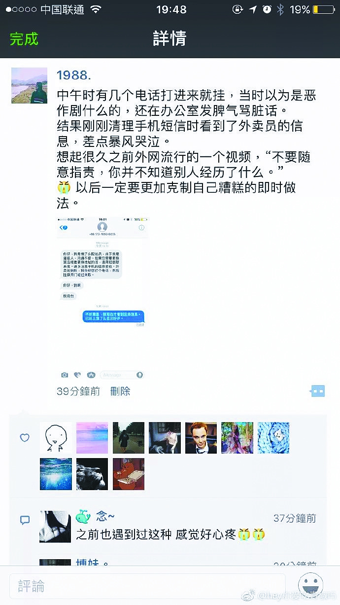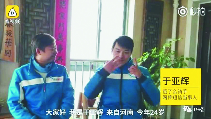 据搜狐网 这几天,微博上有一个关于外卖小哥的采访视频很火,很多网友看了都表示感动得直哭。 事情还得从一位杭州网友发的一条微博说起。 11月28日,网友@hey你爱吃青椒吗发文分享了自己遇到的一件事情:点外卖之后接到几个没有声音的来电,都是一接通就挂断,当时以为是恶作剧,所以忍不住发了脾气,后来才发现外卖员的短信。原来外卖员是聋哑人,在短信里解释了沟通不便的苦衷,需要通过打电话来提醒顾客外卖已送到的讯息。网友对于自己的没耐心感到十分自责,所以在网上呼吁大家如果遇到这种情况的话最好检查一下有没有被忽视的短信,不要急着发脾气给差评,伤害到这些努力工作的特殊人群。 发短信的那位外卖小哥叫于亚辉,左边坐着的是他的队长,同样是聋哑人的许兴方。在自我介绍时,许兴方说自己找工作非常困难,可自己很想多赚点钱。于亚辉则说,是老许带他入行的,他很开心。 由于沟通不便,聋哑骑手们在送餐前都会提前给用户编辑好短信,告知餐送到时会给用户打电话再挂掉。这种方式能基本完成好工作,但于亚辉和许兴方也为自己联系不上用户感到过苦恼。 看了视频的网友们都很动容,特别是被他们那种对工作对生活满满的热爱所触动。