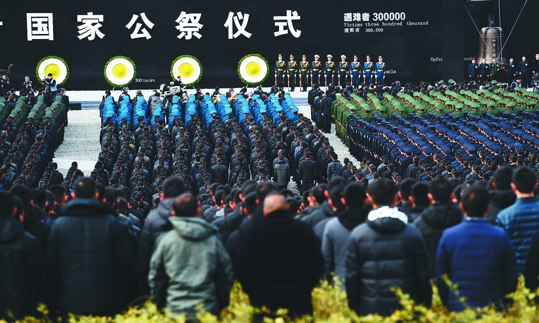 据新华社电(记者霍小光张晓松蔡玉高)中共中央、全国人大常委会、国务院、全国政协、中央军委13日上午在南京隆重举行南京大屠杀死难者国家公祭仪式。中共中央总书记、国家主席、中央军委主席习近平出席仪式。全国政协主席俞正声出席仪式并讲话。 公祭仪式在侵华日军南京大屠杀遇难同胞纪念馆举行。纪念馆集会广场庄严肃穆,现场国旗下半旗。广场西侧巨大的“灾难墙”上,灰黑的底色映衬着“南京大屠杀死难者国家公祭仪式”14个白色大字。约1万名各界代表胸前佩戴白花,静静肃立。 9时58分,习近平等党和国家领导人步入仪式现场,站在各界代表方阵前。中国人民解放军三军仪仗队18名礼兵肩枪齐步行进至公祭台两侧伫立。 10时整,公祭仪式开始。军乐团演奏《义勇军进行曲》,全场高唱中华人民共和国国歌,嘹亮的歌声响彻云霄。国歌唱毕,全场向南京大屠杀死难者默哀。同一时间,公祭现场和南京全城拉响防空警报,汽车、火车、轮船汽笛齐鸣,行人就地默哀。 默哀毕,军乐团演奏《国家公祭献曲》,中国人民解放军三军仪仗队礼兵抬着8个花圈,缓步走上公祭台,将花圈敬献于“灾难墙”前。80名南京市青少年代表宣读《和平宣言》。 之后,俞正声发表讲话。他表示,今天,我们在这里隆重举行南京大屠杀死难者国家公祭仪式,为的是深切缅怀南京大屠杀死难者,缅怀惨遭日本侵略者杀戮的所有死难同胞,缅怀为中国人民抗日战争胜利献出生命的革命先烈和民族英雄,缅怀同中国人民携手抗击日本侵略者献出生命的国际战士和国际友人,宣示中国人民铭记历史、缅怀先烈、珍爱和平、开创未来的坚定立场,庄严表达走和平发展道路的崇高愿望。 俞正声指出,只有正确认识历史,才能更好开创未来。战争是一面镜子,能够让人更好认识和平的珍贵。日本军国主义发动的侵华战争,给中国人民造成巨大灾难,也给日本人民带来巨大伤害。中日两国要从两国人民根本利益出发,更加珍惜来之不易的和平,共同为人类和平作出贡献。 俞正声强调,和平需要国际社会共同努力,需要大家一起坦诚面对历史。为了和平,世界各国人民要同心协力,共同维护以联合国宪章宗旨和原则为核心的国际秩序和国际体系,共同推进人类和平与发展的崇高事业。 俞正声指出,今天,中国人民比历史上任何时期都更接近、更有信心、更有能力实现中华民族伟大复兴。在新的征程上,中国人民将自觉坚持以习近平新时代中国特色社会主义思想为指导,在中国共产党坚强领导下,全面推进新时代中国特色社会主义伟大事业,不断创造更加美好的幸福生活。中国人民愿同世界各国人民一道,推动构建人类命运共同体,始终做世界和平的建设者、全球发展的贡献者、国际秩序的维护者,共同创造人类的美好未来。 俞正声讲话后,6名南京市各界代表3次撞响“和平大钟”。随着深沉悠远的钟声,3000只和平鸽凌空飞翔,寓意着对30万死难者的深深追思和圆梦中华的雄心壮志。 公祭仪式结束后,习近平走进纪念馆展厅,参观了《南京大屠杀史实展》。参观结束时,习近平在签字簿上庄重签名。 随后,习近平亲切会见了南京大屠杀幸存者代表和为中国人民抗日战争胜利作出贡献的国际友人亲属代表。 丁薛祥、刘鹤、刘延东、许其亮、吉炳轩一同参加上述活动。 黄坤明主持公祭仪式。 80年前的1937年12月13日,侵华日军侵入南京,对我同胞实施长达40多天灭绝人性的大屠杀,30万生灵惨遭杀戮,留下人类文明史上最黑暗的一页。2014年2月27日,十二届全国人大常委会第七次会议通过决定,以立法形式将12月13日设立为南京大屠杀死难者国家公祭日。 12月13日,南京大屠杀死难者国家公祭仪式现场。 新华社记者韩瑜庆摄