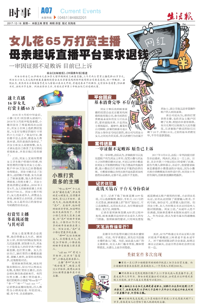 女儿花65万打赏主播母亲起诉直播平台要求退钱