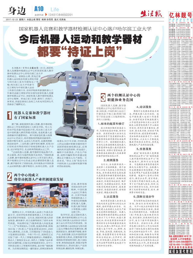 生活报讯(首席记者崔立东)20日,国家机器人竞赛器材检测认证中心和国家机器人教学器材检测认证中心在哈尔滨工业大学挂牌成立。省政协主席、黑龙江省机器人运动协会名誉主席杜宇新与哈尔滨工业大学副校长丁雪梅;哈尔滨工业大学党委书记王树权与中国机器人运动工作委员会副主任、全国学校体育联盟机器人工 作委员会副主席张学军分别为国家机器人竞赛器材检测认证中心、国家机器人教学器材检测认证中心揭牌。黑龙江省工信委、教育厅、科技厅、体育局、质量监督局以及哈工大机电学院师生代表参加了揭牌仪式。 1 机器人竞赛和教学器材有了国家标准 据了解,承担国家机器人竞赛、教学器材检测认证工作任务的是哈工大机电学院。哈工大机电学院党委书记赵航介绍,哈尔滨工业大学是中国机器人研究的重点院校,也是机器人运动和教学的重要单位。两个国家级机器人检测认证中心的成立,将在塑胶类拼插类创新套件、陆地平衡车系列、运动无人机系列、金属类拼插类创新套件、工业机器人教学类机械臂、初级3D打印机系列等系列项目领域受理机器人生产企业、设计研发单位、社会机构等检测认证工作。 “过去机器人竞赛、教学器材市场良莠不齐、鱼目混珠、各自为战的现象至此终结。”国家机器人竞赛、教学器材检测认证中心主任王滨生表示,两个检测认证中心的成立标志着国家机器人竞赛、教学器材有了国家标准,将有效推动中国机器人运动和机器人教学规范化、标准化进程。这意味着从2017年开始,中国机器人的运动器材和教学器材将开启国家级标准检测认证,此领域内所涉及的材料、样品设计、编程平台和算法、产品生产标准、说明书编制等均须通过检测认证方能进入生产流程。王滨生说,“持证上岗”将是今后中国机器人运动器材和教学器材的标准流程。 2 两个中心的成立将带动机器人产业积极健康发展 揭牌仪式上,中国机器人运动工作委员会副主任、全国学校体育联盟机器人工作委员会副主席张学军致辞。近年来,国家将机器人的研发制造、教育教学、项目竞赛等提到了前所未有的高度。科技部印发了《服务机器人科技发展“十二五”专项规划》;工信部、发展改革委、财政部印发了《机器人产业发展规划(2016-2020年)》;教育部、人社部、工信部印发了《制造业人才发展规划指南》。今年7月8日,国务院正式印发了《新一代人工智能发展规划》,明确要求,推动人工智能安全认证,评估人工智能产品和系统的关键性能;实施全民智能教育项目,在中小学阶段设置人工智能相关课程,逐步推广编程教育。为贯彻国务院这一通知要求,按照国家体育总局、教育部和全国友协的文件精神,中国机器人运动工作委员会、全国学校体育联盟机器人工作委员会积极做好机器人竞赛、机器人教学和青少年机器人国际交流工作。 张学军说,成立国家机器人竞赛、教学器材检测认证中心是黑龙江省机器人运动协会与哈尔滨工业大学共同合作的成果。黑龙江省机器人运动协会与哈尔滨工业大学整合各自资源优势,围绕国家安全、教育教学领域、体育产业、体育竞赛、民生科技和经济发展的重大需求,在服务教学领域和体育领域的同时,抢占国防军事、智能制造装备、资源开发等领域制高点,带动机器人产业的积极发展、健康发展、有效发展。 3 两个检测认证中心的职能和业务范围 国家机器人竞赛、教学器材检测认证中心是在国家认证委、国标委、中国机器人运动工作委员会(下称工委)等部门领导下的社会第三方服务机构。具有六大职能: 1、标准的起草和修订 设立和组织相关标委会工作,与国际标委会对接,制修订标准。在国家机器人标准化总体组的领导下负责国家机器人竞赛器材和教学器材标准起草和修订工作。协助国家机器人标准化总体组梳理我国机器人竞赛器材和机器人教学器材体系和框架、制修订国家标准,管理和推动我国机器人竞技器材和教学器材标准化工作。 2、检测服务 为行业、企业提供国内一流的第三方检测服务。两个分中心以哈工大机电工程学院为依托,具体建设内容包括机器人竞赛器材和教学器材的整机性能和安全试验室、机械环境试验室、环境影响试验室、噪声试验室、电磁兼容试验室、电动伺服系统测试试验室、减速器试验室、传感器试验室、控制器试验室、储能试验室等。 3、认证服务 配合国家机器人标准化总体组及政府主管部门制定认证规则,适时开展认证活动。认证是建立在检测之上的生产制造全流程的质量把控。机器人竞赛器材和教学器材认证规划包括以下几个部分:机器人整机认证:针对竞赛器材和教学器材的安全和电磁兼容性能进行认证;机器人部件认证:针对机器人各个部件,如:材料、电池、导线、控制器、伺服电机、变速器、传感器等进行专项性能和安全的认证;应用评定、评估:针对机器人在各种工况和应用过程中的整体系统进行可靠性和安全评估。 4、培训服务 跟踪行业发展和新技术动态,开展机器人技术培训。通过中国机器人运动工作委员会、全国学校体育联盟机器人工作委员会和哈尔滨工业大学机电工程学院将两个中心推进目标为:共同打造专兼结合、理念新、技术能力强、培训水平高的师资队伍;建设集理论辅导、实训和职业技能鉴定于一体的实训基地,以企业