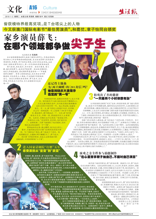 生活报记者吴海鸥 在日前刚刚落幕的第九届澳门国际电影节上,凭借在网络电影《活纸人》中分饰两角的精湛演技,实力派演员薛飞获得最佳男演员奖,和葛优、章子怡同台领奖,从哈尔滨走出的他,也成为澳门国际电影节历史上,第一位凭网络电影获奖的演员。 薛飞获奖,朋友高兴,但不惊讶。在他们看来,有天赋、能吃苦的薛飞,成功是早晚的事。就如他当模特时,经过几年稳扎稳打,得过模特界最高奖项——“中国最佳职业模特”。将重心转到演戏后,他又拿出当年那股拼劲,不论角色大小都接,只为挖掘不同层面的自己。接受生活报记者采访时,薛飞表示,这次拿奖,对他来说只是开始,自己会踏踏实实走好每一步。 1 还记得主题曲为《两只蝴蝶》的《281封信》吗? 他是刘晓庆大浪淘沙选定的“男一号” 有着俊朗外表、超模身材的薛飞,起点不算低。刚当演员不久就主演《其实你不懂我的心》,之后又被刘晓庆选中,在内地首部时装偶像剧《281封信》中担任男一号。选上的过程,也蛮戏剧化。有一天,薛飞经纪人给他打电话,说刘晓庆正为一部戏选男一号,已经看了200多个男演员,都没相中,要不要去试一下。当时,薛飞的爸爸也在北京,爷俩一想,那就跟经纪人去看看呗。见面后,刘晓庆还开玩笑说:“场面挺大呀,带俩经纪人呢。”说说笑笑、拍拍照,他们就回去了。没想到第二天薛飞就接到了电话通知,说刘晓庆选定他来演男一号“于枫”。 篮球运动员出身、做过模特,也当过主持人、歌手,丰富的职业经历对薛飞诠释角色有很大帮助。为了演好这个角色,薛飞也没少下功夫。电视剧播出后,主题曲《两只蝴蝶》火了,薛飞也火了。现在薛飞的很多粉丝,也是从这部戏就开始追随他的,平时依然称他“小于哥”。 2 进入国家话剧院“打磨”五年感受演技从“量变”到“质变” 凭借帅、酷、能吃苦,薛飞戏约不断。不过从2009年开始,薛飞意识到,作为演员还是需要多学习、沉淀。 在拍《空姐日记》时,于敏导演偶然提起中国国家话剧院,说那里是“演员队伍里的国家队”,给正在思考要到哪学习的薛飞提了个醒。经过一番努力,薛飞考入中国国家话剧院戏剧表演专业首期培训班,之后成为国家话剧院的一员,踏踏实实演了5年话剧。 条件不错、又肯吃苦的薛飞,一进话剧院,就被国家一级导演田沁鑫选中,在翻拍自徐峥的癫狂喜剧《夜店之天生绝配》中,出演主角“何三水”。这部剧如今已演出近150场,在北京小剧场话剧中收获了四轮票房第一的好成绩,随后薛飞又主演了朱德庸同名漫画改编的话剧《大家都有病》等。 对于演员来说,专心演话剧的日子,在经济上肯定跟拍影视剧没法比。同是国家话剧院的演员,就算是孙红雷、章子怡、秦海璐,也是900块钱一场。不过在薛飞看来,这段日子也是最长功夫的,“我们每天都在排练。导演会给演员慢慢抠戏,先打压你、让你没有自信,觉得自己都不会演戏了。之后又像凤凰一样涅槃重生,一点点在台上立起来。” 如今只要国家话剧院有演出,薛飞都会随叫随到。去年,薛飞就跟随刘威、朱媛媛、娜仁花、刘佩琦一起,在哈尔滨大剧院为家乡观众演出《大宅门》。在跟老师们一起学习、摸爬滚打中,薛飞也感受着,自己的演技从量变到质变的过程。 3 拍戏出了名的能拼“一天睡两个小时依然有劲” 从中国国家话剧院“闭关”出来、再拍影视剧,薛飞最大的改变,就是不再有偶像包袱,接的角色也类型多样,比如《爸爸父亲爹》里的张雄、《激战》里的青木、《海上丝路》的西巴托、《左轮手枪》中的萧鹤峰,以及这次让他斩获澳门国际电影节最佳男演员奖的《活纸人》。片中,他分饰两角,时而刚正、时而腹黑、时而懦弱、时而阳光,为了展现人物最真实的状态,他主动要求把皮肤化黑、手指甲里沾满泥土,细节入微的表演,获得评委一致好评。 和薛飞拍过戏的人都知道,薛飞拍戏出了名的认真、不怕吃苦。在片场,经常会看到他在默词,有时导演都说“不错,过了”,如果他自己不满意,还是会追着申请“能不能再拍一条。”这次拍《活纸人》也不例外。这次拍摄场地选在了江西婺源篁岭,景色优美,拍摄条件却非常艰苦,车上不去,每天剧组都要徒步到拍摄地,演员拿着自己的衣服,拍摄器材、灯光等都要靠人工搬运,平均每天只睡两个小时。但薛飞称,就算每天睡两个小时也有劲儿,“当演员,有的人是为了名、有的是为了利,我是真心喜欢这门艺术。在剧组苦一点没事,只要戏ok,就好。” 在剧组吃的这些苦,薛飞从不让父母知道。“拍《左轮手枪》时,我的父母是第一次从哈尔滨来探班。当天拍的戏挺简单,就是骑马、说词,一上午拍下来,他们说,‘儿子,你这么累呀’。当时我心里想,您二老是真没看到我吃苦的时候啊,但我确实是跟父母报喜不报忧的,我从小就怀揣梦想拎着箱子只身来北京,虽然每年都回哈尔滨,但大部分时间还是不能陪在父母身边,我不能再让他们为我操心了。” 4 演戏之余全程参与拍摄制作 “在心里常拿鞭子抽自己,不能对自己满意” 演员是个被动的职业,薛飞深谙此理。做演员之余,薛飞也在尝试全程参与幕后。比如这次的《活纸人》,从立项、抓剧本、改剧本、到服装造型、筹备选景、拍摄,再到后期配音合成卖片等,他全程参与。同 样全程参与拍摄制作并主演的,还有玄幻电影《九天玄鸟》,这部戏在网络播出3天就获