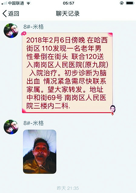 生活报讯(记者时继凯)8日,一条求助信息引爆朋友圈,上面写道:6日傍晚,在哈尔滨哈西街区,民警发现一名老人昏倒在地,民警随后与120急救人员将老人送到哈尔滨市南岗区人民医院,初步诊断为脑出血,情况紧急需要尽快联系家属,望大家转发,并留有医院地址和老人所在科室,还附有老人照片。据了解,通过广大微友不断助力转发,老人家属次日就赶到了医院。 据南岗区人民医院内二科主任陈秀华介绍,这名老人有70多岁,被送来时身上没有任何身份证明,老人当时处于昏迷状态,初步诊断为脑出血,病情非常严重。医护人员一边抢救一边想办法寻找老人家属,科室18名医护人员通过微信朋友圈不断转发老人情况。7日,老人家属就赶来了。家属表示,老人目前是一个人生活,由其弟弟照顾,家人对所有参与救助的人士表示感谢。当日,老人已转院治疗。 同时,护士长贾红告诉生活报记者,该院经常收到这种身上没有身份证明的患者,其中很多都是这种危重老人。当日,医护人员将老人情况通过朋友圈转发后,不想获得了广大微友和爱心人士的大力支持,朋友圈爱心人士不仅对这种救助患者行为点赞,还不断助力转发,而用这种方式找到患者家人,在该科室已不是头一次了。 生活报报料平台提供