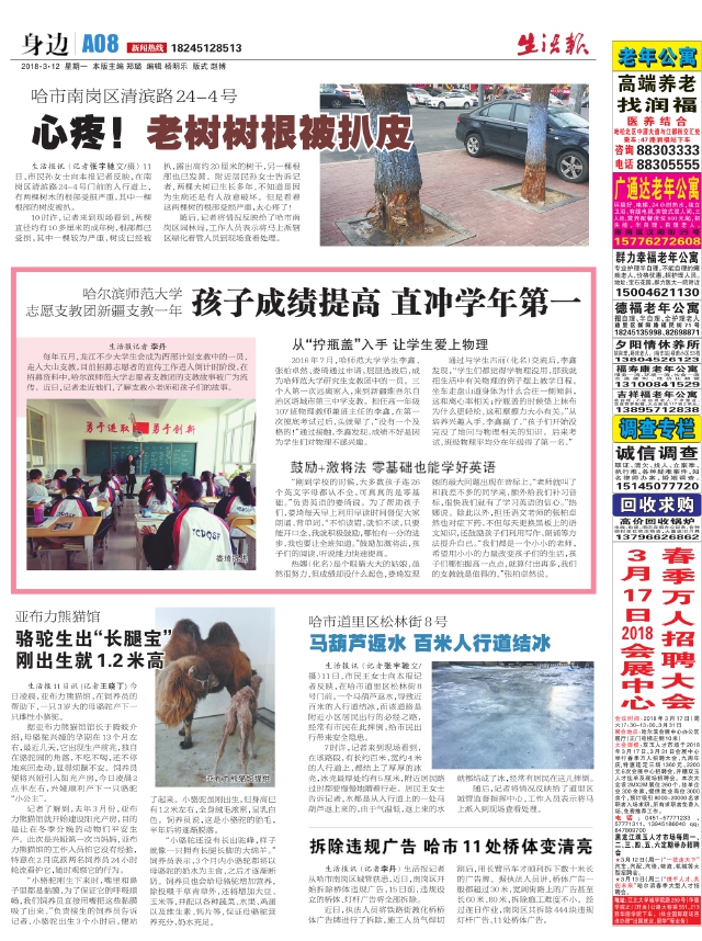 生活报11日讯(记者王晓丁)今日凌晨,亚布力熊猫馆,在饲养员的帮助下,一只3岁大的母骆驼产下一只雌性小骆驼。 据亚布力熊猫馆馆长于腾蛟介绍,母骆驼兴娅的孕期在13个月左右,最近几天,它出现生产前兆,独自在骆驼园的角落,不吃不喝,还不停地来回走动,显得烦躁不安。饲养员便将兴娅引入阳光产房,今日凌晨2点半左右,兴娅顺利产下一只骆驼“小公主”。 记者了解到,去年3月份,亚布力熊猫馆就开始建设阳光产房,目的是让在冬季分娩的动物们平安生产。此次是兴娅第一次当妈妈,亚布力熊猫馆的工作人员怕它没有经验,特意在2月底派两名饲养员24小时轮流看护它,随时观察它的行为。 “小骆驼刚生下来时,嘴里和鼻子里都是黏膜,为了保证它的呼吸顺畅,我们饲养员直接用嘴把这些黏膜吸了出来。”负责接生的饲养员告诉记者,小骆驼出生3个小时后,便站了起来。小骆驼虽刚出生,但身高已有1.2米左右,全身绒毛浓密,呈乳白色。饲养员说,这是小骆驼的胎毛,半年后将逐渐脱落。 “小骆驼还没有长出驼峰,样子就像一只拥有长腿长脚的大绵羊。”饲养员表示,3个月内小骆驼都将以母骆驼的奶水为主食,之后才逐渐断奶。饲养员也会给母骆驼增加营养,除投喂干草青草外,还将增加大豆、玉米等,并配以各种蔬菜、水果、鸡蛋以及维生素、钙片等,保证母骆驼营养充分,奶水充足。