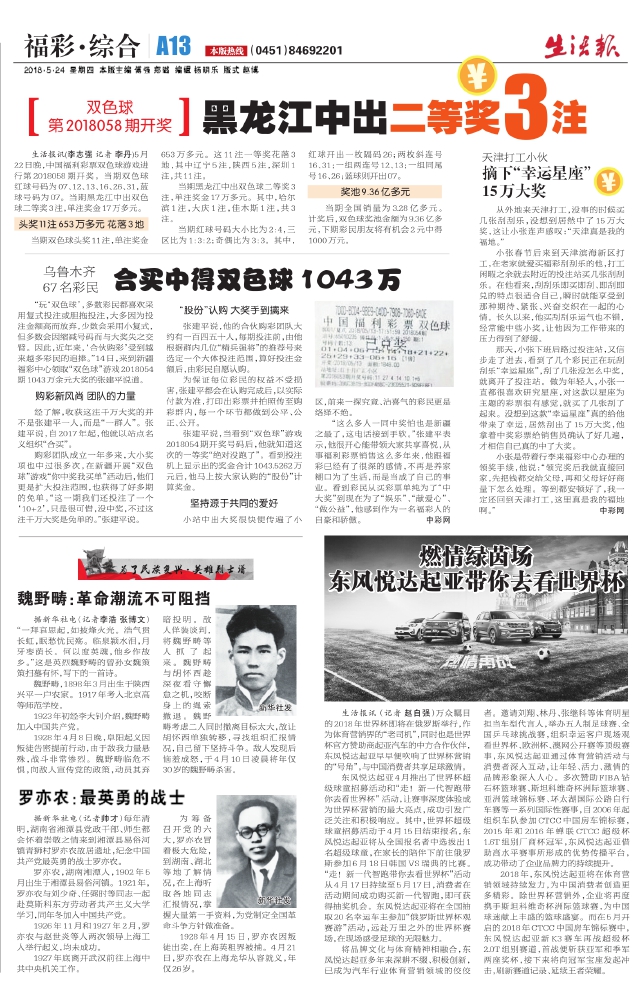 黑龙江中出二等奖3注