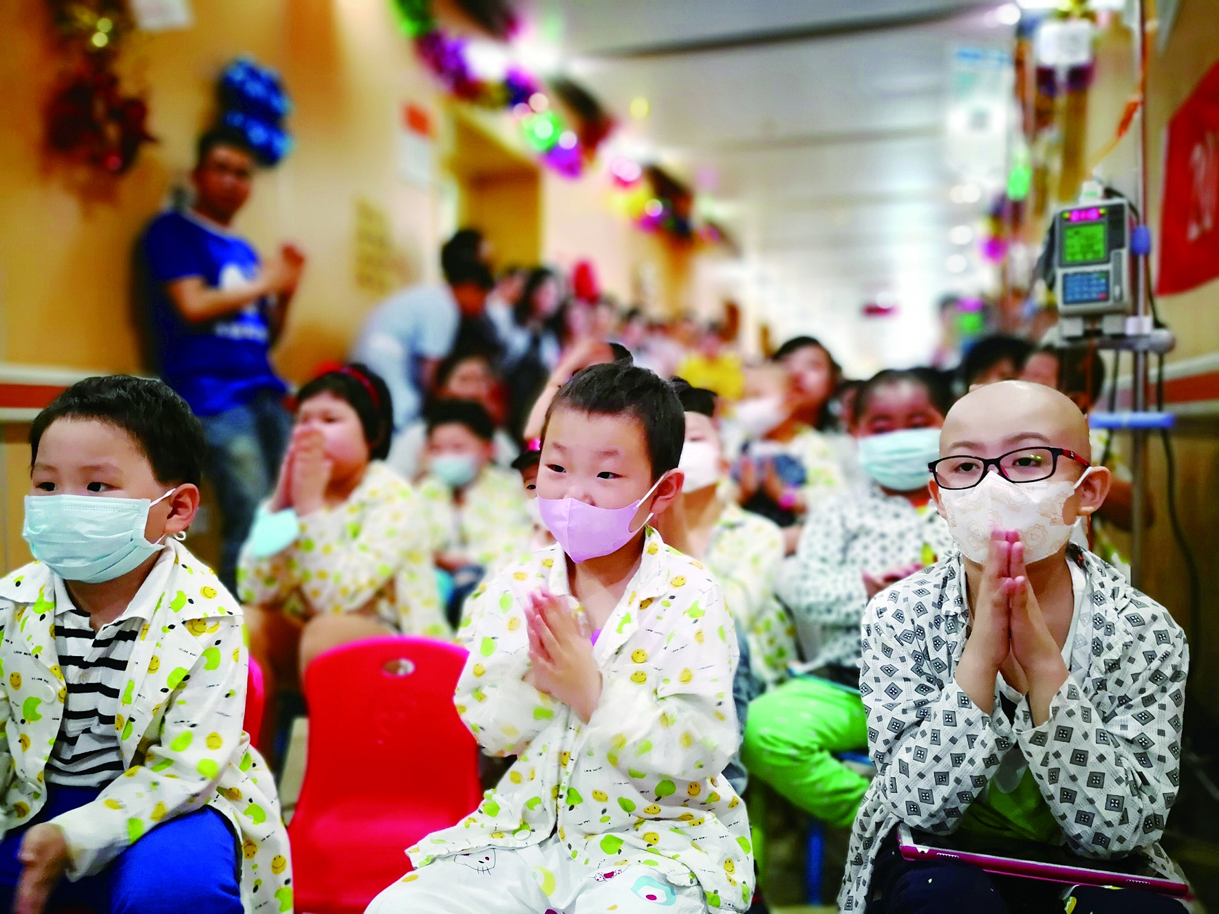 生活报30日讯(记者霍营文/摄)30日,一个别开生面的“联欢会”在哈医大一院儿童血液病病房举办,住在这里的60余名白血病患儿提前过了一个别样的六一儿童节。记者看到,整个病房走廊的墙上挂着拉花、气球,门口摆着玩具,白血病患儿们坐在小板凳上,满怀期待地迎接属于他们自己的节日。 活动现场,白血病儿童浩浩(化名)和他的妈妈余女士作为代表,和在场的小朋友们分享了患病以来的心路历程。余女士说,2014年,浩浩被诊断患上了急性淋巴T细胞白血病,是儿童白血病中比较难治愈的一种类型。由于病情发展很快,2015年,浩浩接受了骨髓移植。如今,浩浩术后已经3年零2个月了,病情一直没有复发,一家人的生活也逐渐步入正轨。现在,浩浩已经13岁,是一名初一学生。他鼓励在场的小朋友们:“要听医生阿姨的话,有一天也会像我一样把白血病击退。” 据哈医大一院儿童血液病房李丽敏主任表示,在很多人看来,白血病是“不治之症”,实际上,儿童白血病并不可怕,只要及时治疗,很多孩子都能像正常人一样生活,治愈率还是较高的。