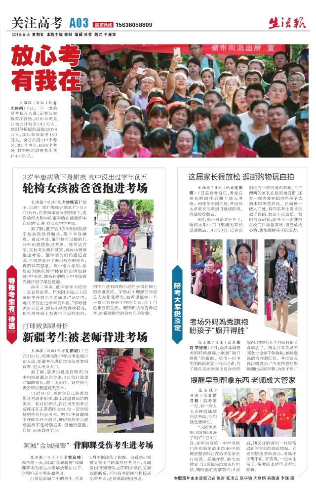 生活报7 日讯(记者 沈丽娟)7 日,一年一度的高考拉开大幕,记者从省教育厅获悉,2018年黑龙江省共计报名19.1 万人,高职单招提前录取20174万人,实际参加高考16.9万人。全省共设119个考区、205个考点、6066个考场,其中哈尔滨市考生共计46135人。 3岁半患病致下身瘫痪高中没出过学年前五 轮椅女孩被爸爸抱进考场 生活报7日讯(记者刘畅言)“孩子,加油!我们等你好消息!”7日8时05分,在老师和家长的祝福下,来自哈师大附中的董宇晗在爸爸怀中自信地“走进”省实验中学考场。 据了解,董宇晗3岁半时因发烧引发突发性脊髓炎,致下半身瘫痪。通过申请,董宇晗可以提前几分钟由爸爸抱进考场。等考试完毕,其他考生离开教室,她再由爸爸抱出考场。董宇晗的妈妈跟记者说,全家感受到了来自各方的关怀,真的非常感恩。高中刚入学时,学校就为她在教学楼台阶边增加斜坡;中考时,她所在的哈三中考场也为她开设了绿色通道。 高中三年来,董宇晗学习成绩一直名列前茅。师大附中高三十四班班主任刘治全老师说:“记忆中,她几乎没出过学年前5名。”宇晗爸爸告诉记者,她从小就很喜欢看书,也经常在网上发表自己写的东西,初中时还有网络小说的公司在网上想找她签约。宇晗心中理想的学校是人大和北师大,她希望能学一个坐着也能好好工作的专业,过上自己想要的生活。老师和父母告诉记者,她希望能学财会方向的专业。 打球致脚踝骨折 新疆考生被老师背进考场 生活报7日讯(记者沈丽娟)7日7时50分,哈师大附中考点考生刚开始入场,新疆考生塔伊尔由体育老师背着,进入考点大门。 据了解,塔伊尔是来自哈市73中内地新疆班的学生,3日他打篮球时脚踝骨折,需手术治疗。好在医生表示可以暂缓两天手术。 11时50分,塔伊尔自己拄着双拐从考场走出来,脸上洋溢着灿烂的笑容。他对记者说,自己当天的考试发挥还在正常范围之内,他一定会坚持把所有科目考完。哈73中新疆部主任陈东升介绍说,塔伊尔的学习成绩虽然不是特别拔尖,但他的坚强、自信、乐观值得学习。 阿城“金城骑警”背脚踝受伤考生进考场 生活报7日讯(记者黄迎峰)高考第一天,阿城“金城骑警”和脚踝手术的考生小雪结成帮扶对子,全程护送小雪参加考试。 小雪是阿城二中的考生,今年5月不慎挫伤了脚踝。当看到小雪被父亲用三轮车拉到考点后,金城派出所骑警队立即和小雪的父亲取得联系,不但高考期间全程接送小雪考试,还背送她进出考场。 这届家长很放松逛街购物玩自拍 生活报7日讯(记者沈丽娟)7日是高考首日,考生在家长的前呼后拥下进入考场。和往年不同的是,并没有太多家长顶着烈日继续陪考,而是纷纷散去。 9时,第一科语文开考了,哈师大附中门口聚集的家长迅速散去。9时30分,记者在附近的一家商场内看到,三三两两的家长在悠闲地逛街,还有一些夫妻在超市给孩子选购水果等营养品。在商场一楼入口处,有四名考生家长玩起了自拍,状态十分放松。他们告诉记者,陪考不一定非得在校门口焦急等待,自己放松心情,也能缓解孩子的压力。 陪考大军挺淡定 考场外妈妈秀旗袍盼孩子“旗开得胜” 生活报7日讯(记者朱莉栾德谦)7日,众多冰城送考妈妈特意穿上寓意“旗开得胜”的旗袍。哈市一位考生的妈妈栾女士告诉记者,为了能在这两天穿上显身形的旗袍,她提前几个月就开始节食减肥了。送女儿来考场的刘女士也穿了件旗袍,她特意选的吉利的红色。考生家长孙洪霞表示:“今天特意把旗袍翻出来熨平整,为孩子穿。” 提醒早到帮拿东西老师成大管家 生活报7日讯(记者徐日明)高考第一天,有一群人七点钟就陆续到达考场,他们就是老师们。 “大刚爸爸啊,你们到考场了吗?”7日8时许,在哈尔滨第一中学考场门外的哈尔滨市第40中的郭景慧老师正在给学生家长打电话。据她介绍,她七点钟到了以后就先给家长打电话,嘱咐他们别落东西;8点后,她又开始询问一些经常迟到的学生的到达情况。同来的姚英老师表示,考场不让带手机、手表等,一些学生带了,带考的老师可以帮忙收着。 本版图片由生活报记者张涛张清云张宇驰沈丽娟栾德谦李巍摄