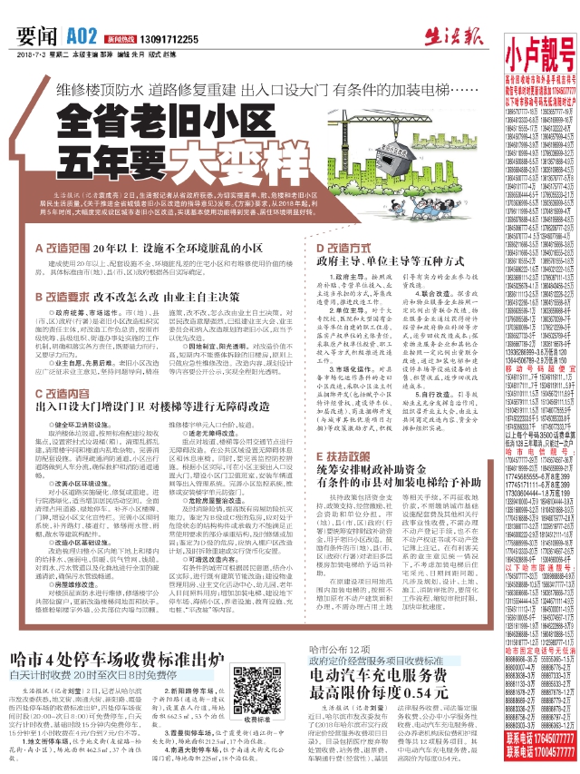生活报讯(记者袁成亮)2日,生活报记者从省政府获悉,为切实提高单、散、危楼和老旧小区居民生活质量,《关于推进全省城镇老旧小区改造的指导意见》发布。《方案》要求,从2018年起,利用5年时间,大幅度完成设区城市老旧小区改造,实现基本使用功能得到完善、居住环境明显好转。 A改造范围20年以上设施不全环境脏乱的小区 建成使用20年以上、配套设施不全、环境脏乱差的住宅小区和有维修使用价值的楼房。具体标准由市(地)、县(市、区)政府根据各自实际确定。 B改造要求改不改怎么改由业主自主决策 ◎政府统筹、市场运作。市(地)、县(市、区)政府(行署)是老旧小区改造组织实施的责任主体,对改造工作负总责,按照市级统筹、县级组织、街道办事处实施的工作机制,明确和落实各方责任,既要量力而行,又要尽力而为。 ◎业主自愿、先易后难。老旧小区改造应广泛征求业主意见,坚持问题导向,精准施策,改不改、怎么改由业主自主决策。对居民改造意愿强烈,已组建业主大会、业主委员会和纳入改造规划的老旧小区,应当予以优先改造。 ◎因地制宜、阳光透明。对改造价值不高,短期内不能整体拆除的旧楼房,原则上只做应急性维修改造。改造内容、规划设计等内容要公开公示,实现全程阳光透明。 C改造内容 出入口设大门增设门卫对楼梯等进行无障碍改造 ◎健全环卫消防设施。 取消楼体垃圾道,按照标准配建垃圾收集点,设置密封式垃圾桶(箱)。清理乱搭乱建,清理楼宇间和楼道内乱堆杂物。完善消防配套设施。清理疏通消防通道,小区出行道路做到人车分流,确保救护和消防通道通畅。 ◎改善小区环境设施。 对小区道路实施硬化、修复或重建。进行院落绿化,适当增加居民活动空间。全面清理占用道路、绿地停车。补齐小区楼牌、门牌,增设小区文化宣传栏。完善小区照明系统,补齐路灯、楼道灯。修缮雨水管、雨棚、散水等建筑构配件。 ◎改造小区基础设施。 改造梳理归整小区内地下地上和楼内的给排水、强弱电、供暖、供气管网、线缆。对雨水、污水管道以及化粪池进行全面的疏通清淤,确保污水管线畅通。 ◎房屋维修改造。 对楼顶屋面防水进行维修,修缮楼宇公共部位窗户,更新改造楼梯间地面和扶手。整修粉刷楼宇外墙、公共部位内墙与顶棚。维修楼宇单元入口台阶、坡道。 ◎适老无障碍改造。 重点对坡道、楼梯等公用交通节点进行无障碍改造。在公共区域设置无障碍休息区和休息座椅。同时,要完善监控防控措施。根据小区实际,可在小区主要出入口设置大门,增设小区门卫值班室,安装车辆道闸等出入管理系统。完善小区监控系统,维修或安装楼宇单元防盗门。 ◎危险房屋整治改造。 及时消除险情,提高既有房屋防险抗灾能力。鉴定为B级或C级的危房,应对处于危险状态的结构构件或承载力不能满足正常使用要求的部分承重结构,及时修缮或加固;鉴定为D级的危房,应纳入棚户区改造计划,及时拆除重建或实行货币化安置。 ◎可增选改造内容。 有条件的城市可根据居民意愿,结合小区实际,进行既有建筑节能改造;建设物业管理用房、业主文化活动中心、幼儿园、老年人日间照料用房;增加加装电梯、建设地下停车场、海绵小区、养老设施、教育设施、充电桩、“平改坡”等内容。 D改造方式 政府主导、单位主导等五种方式 1.政府主导。按照政府补贴、专营单位投入、业主适当承担的方式,筹集改造费用,推进改造工作。 2.单位主导。对于大专院校、医院和大型国有企业等单位自建的职工住房,落实产权单位的主体责任,采取原产权单位投资、职工投入等方式积极推进改造工作。 3.市场化运作。对具备市场化运作条件的老旧小区改造,采取小区业主利益捆绑开发(包括赋予小区特许经营权、建设停车位、加层改造)、商业捆绑开发(与城市其他优质项目打捆)等政策激励方式,积极引导有实力的企业参与投资改造。 4.联合改造。探索政府和物业服务企业按照一定比例出资联合改造,物业服务企业通过获得特许经营和政府物业补助等方式,逐步回收改造成本;探索物业服务企业和其他企业按照一定比例出资联合改造,通过加装电梯和建设停车场等设施设备的出售、租赁收益,逐步回收改造成本。 5.自行改造。引导鼓励业主充分发挥自治作用,组织召开业主大会,由业主共同商定改造内容、资金分摊和组织实施。 E扶持政策 统筹安排财政补助资金 有条件的市县对加装电梯给予补助 扶持政策包括资金支持、政策支持、经营激励、社会资助和单位分担。市(地)、县(市、区)政府(行署)要统筹安排财政补助资金,用于老旧小区改造。鼓励有条件的市(地)、县(市、区)政府(行署)对老旧多层楼房加装电梯给予适当补助。 在原建设项目用地范围内加装电梯的,按照不增加原有不动产建筑面积办理,不需办理占用土地等相关手续,不再征收地价款,不需缴纳城市基础设施配套费及其他相关行政事业性收费,不需办理不动产登记手续,也不在不动产权证书或不动产登记簿上注记。在有利害关系的业主意见统一情况下,不考虑加装电梯后住宅采光、日照间距问题。凡涉及规划、设计、土地、施工、消防审批的,要简化工作流程、缩短审批时限,加快审批速度。