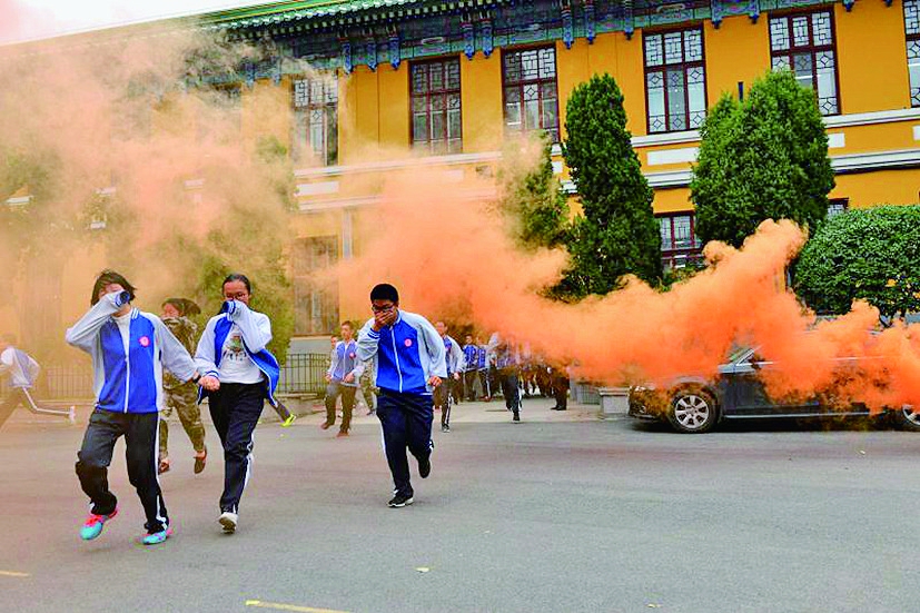 12日上午,哈市公安消防支队与哈三中南岗校区联合开展消防演练活动。10时许,滚滚浓烟在校园内扩散,警报立刻响起,老师们按照应急预案,迅速组织学生疏散。同时南岗消防中队出动3台消防车采取灭火救援行动。5分钟后,火被完全扑灭。演练中,消防战士还向同学们展示了液压多功能钳、钢筋速断器等消防设备,一些同学还在消防战士的指导下亲身体验了一下32米直臂云梯车登高获救的过程。 生活报记者杨雪楠摄
