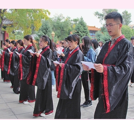 9月28日14时,哈尔滨工程大学人文社会科学学院在哈尔滨文庙举办孔子诞辰2569周年祭祀典礼,给新生们上了一堂特殊的“开学一课”,传承中国传统文化。活动分四个环节,“观礼学生行礼”“主祭官诵祭文”“拜读儒家经典,感悟先师智慧”“参观孔庙”。 金声杨翩然生活报记者朱莉