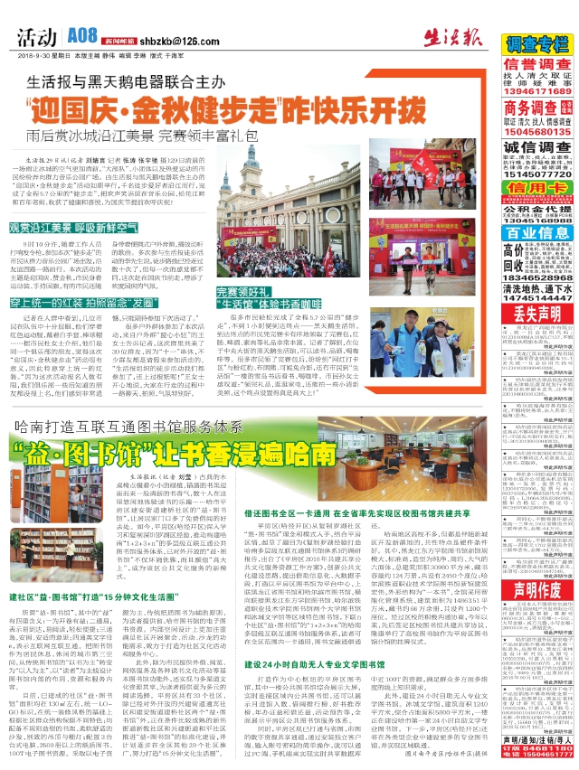 生活报讯(记者刘莹)古典的木桌椅点缀着小小的绿植,错落的书架迎面而来一股清新的书香气,数十人在这里悠闲地体验读书的乐趣……哈市平房区建安街道建桥社区的“益·图书馆”,让居民家门口多了免费借阅的好去处。如今,平房区(哈经开区)深入学习和复制深圳罗湖区经验,推动构建哈南“1+2+3+n”的多层级互联互通公共图书馆服务体系,已对外开放的“益·图书馆”不仅环境优雅,而且颜值“高大上”,成为该区公共文化服务的新模式。 建社区“益·图书馆”打造“15分钟文化生活圈” 所谓“益·图书馆”,其中的“益”有四重含义:一为开卷有益;二通易,表示易到达,易阅读,轻松便捷;三通逸,安闲、安适的意思;四通英文字母e,表示互联网互联互通。把图书馆作为居民休息、休闲的城市第三空间,从传统图书馆的“以书为主”转变为“以人为主”,以“读者”为主线设计图书馆内部的布局、资源和服务内容。 目前,已建成的社区“益·图书馆”面积均在130㎡左右,统一LOGO标识,在统一装修风格的基础上根据社区群众结构保留不同特色;均配备不规则造型的书架、柔软舒适的沙发、别致的吊顶与棚灯;配置3台台式电脑、2500册以上的纸质图书、100T电子图书资源。采取以电子资源为主、传统纸质图书为辅的原则,为读者提供省、哈市图书馆的电子图书资源。内部空间设计上更加注重满足社区开展聚会、活动、沙龙的功能需求,致力于打造为社区文化活动和服务中心。 此外,除为市民提供外借、阅览、网络服务及各种读书文化活动等基本图书馆功能外,还实现与多渠道文化资源共享,为读者提供更为多元的阅读选择。平房区共有33个社区,除已经对外开放的兴建街道通宾社区和建安街道建桥社区两个“益·图书馆”外,正在条件比较成熟的新伟街道新牧社区和兴建街道和平社区推进“益·图书馆”的标准化建设,并计划逐步在全区其他29个社区推广,努力打造“15分钟文化生活圈”。 借还图书全区一卡通用在全省率先实现区校图书馆共建共享 平房区(哈经开区)从复制罗湖社区“悠·图书馆”理念和模式入手,结合平房区情,起草了题目为《复制罗湖经验打造哈南多层级互联互通图书馆体系》的调研报告,出台了《平房区2018年共建共享公共文化服务资源工作方案》,创新公共文化建设思路,提出借助信息化、大数据手段,打造以平房区图书馆为平台中心,上联黑龙江省图书馆和哈尔滨市图书馆,横向联接黑龙江东方学院图书馆、哈尔滨铁道职业技术学院图书馆两个大学图书馆和冰城文学馆等区域特色图书馆,下联n个社区“益·图书馆”的“1+2+3+n”的哈南多层级互联互通图书馆服务体系,读者可在全区范围内一卡通用,图书文献通借通还。 哈南地区高校不多,但都是伴随新城区开发新落地的,共性特点是硬件条件好。其中,黑龙江东方学院图书馆新馆规模大、标准高,造型为纯净、简约、大气的六面体,总建筑面积30980平方米,藏书容量约124万册,共设有2450个座位;哈尔滨铁道职业技术学院图书馆新馆建筑宏伟,外形结构为“一本书”,全馆采用智能化管理系统,建筑面积为14863.51平方米,藏书约66万余册,共设有1200个座位。经过区校的积极沟通协商,今年以来,先后签定区校图书馆共建共享协议,隆重举行了高校图书馆作为平房区图书馆分馆的挂牌仪式。 建设24小时自助无人专业文学图书馆 打造作为中心枢纽的平房区图书馆,其中一楼公共图书馆综合展示大屏,实时连接区域内公共图书馆,还可以展示月进馆人数、借阅排行榜、好书推荐榜、年办证量和借还量、活动预告等,全面展示平房区公共图书馆服务体系。 同时,平房区现已打通与省图、市图的数字资源共享通道,通过安装独立客户端、输入账号密码的简单操作,就可以通过PC端、手机端来实现实时共享数据库中近100T的资源,满足群众多方面多维度的线上知识需求。 此外,建设24小时自助无人专业文学图书馆。冰城文学馆,建筑面积1240平方米,综合占地面积5800平方米,一楼正在建设哈市第一家24小时自助文学专业图书馆。下一步,平房区(哈经开区)还将在各类型企业中建设更多的专业图书馆,并实现区域联通。 图片由平房区(哈经开区)提供