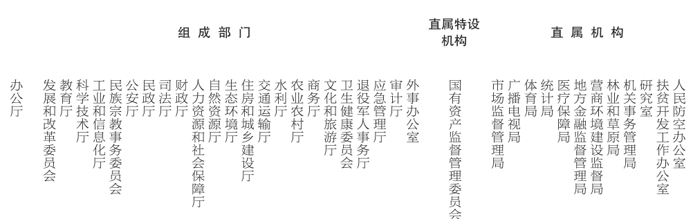 说明: 黑龙江省人民政府设置工作部门37个。其中,办公厅和组成部门24个,直属特设机构1个,直属机构12个。发展和改革委员会挂能源局牌子;科学技术厅挂外国专家局牌子;文化和旅游厅挂文物管理局牌子;市场监督管理局挂省政府食品安全委员会办公室牌子;地方金融监督管理局挂金融工作办公室牌子;研究室挂参事室牌子。 此外,设置部门管理机构6个。其中,粮食局由发展和改革委员会管理;监狱管理局由司法厅管理;中医药管理局由卫生健康委员会管理;煤炭生产安全管理局由应急管理厅管理;药品监督管理局、知识产权局由市场监督管理局管理。