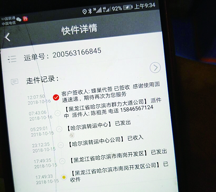 生活报讯(记者李威兵文/摄)14日,住在哈市群力的侯女士在南岗开发区某中医馆买了些汤药,并在中医馆留下了电话与地址。中医馆告诉侯女士15日便会通过快递将熬好的汤药送到侯女士家中,可是约定的时间过了4天,侯女士还是没收到汤药,侯女士赶紧打电话询问中医馆,中医馆告诉侯女士,15日就已经将药寄出去了。 市民反映:同城快递汤药5天都没送到 “汤药不冷藏两三天不得坏了?这都5天了才说要给我送,我还能要吗?”19日,侯女士还没收到汤药,向中医馆询问后,圆通快递的送货员给侯女士打来电话,告诉侯女士现在就把汤药送去,但是侯女士表示不敢收货。 侯女士告诉记者,侯女士与丈夫就怕汤药送来时家里没人,天天盯着手机看有没有快递送来。从15日一直等到了18日,既没收到短信,也没接到电话,中医馆得知后也赶紧联系了负责送货的圆通快递。19日,侯女士接到圆通快递送货员的电话,送货员告诉侯女士,因为手机号留错了,送货员休假等原因导致货一直没送到。侯女士说:“我留的电话和地址都反复核对了好几次,根本就不可能错,我觉得这中间肯定是快递出了什么问题。” 记者走访发现:电话号码被写错汤药没送货却显示签收 21日,记者到中医馆、圆通快递送货点进行走访,发现电话确实留错了,但是快递公司也确实没有尽到责任与义务。中医馆的工作人员拿出了15日的记录,记录上表明侯女士确实在这里买过药,但是在寄件过程中他们将侯女士的电话号码多写了一位数。记者又来到圆通快递海河东路配送点,工作人员表示这个单子有问题,但是已经处理了,送货员告诉记者,药是正常送出去的,16日已经签收了,这次配送先是由海河东路运货点负责收货,然后将货发送给群力的配送点。 随后,记者联系到群力送货点的工作人员,工作人员表示配送过程中确实出现了问题,但是药绝对没有在16日送到。工作人员表示,他们发现电话是错的,就直接报了问题件,16日根本就没给送货,一直到19日侯女士问完中医馆,中医馆的人反映后才给送的货,但是被拒收了。“电话号码是错的,我们联系不上收货人,不可能把货扔蜂巢里,也不可能有签收,那边显示的签收是误签,我们发现电话号码不对就按问题件报客服了,之后就是客服处理了。” 海河东路配送点经理:配送确实有问题我们肯定会给解决 21日,记者联系到圆通快递海河东路配送点的经理,经理表示,这次配送确实存在问题,“我联系中医馆了,也联系收货人了,在我们这边走出去的(货)我们肯定会给他个结果。如果电话写错了,(送货员)正常送,那就是电话的问题,如果我们这边出现问题反馈的慢了,那就是我们的问题。是谁的责任就追谁的责任,现在给出两种解决办法,一种是钱赔给收件人,还有一种是中医馆重新熬药。这个问题肯定能解决。”对此,本报记者将持续关注此事。 快递单据上的电话有12位数 快件显示签收