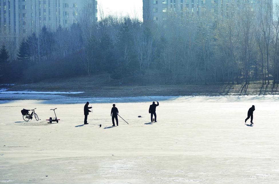 21日,哈市道里区群力体育公园内的湖面已经上冻,多位冬季运动爱好者纷纷在冰上进行抽尜、滑冰等娱乐活动,但由于还没有进入深冬,本报温馨提醒市民小心游玩,以防冰面冻得不实出现安全隐患。 生活报记者张宇驰摄