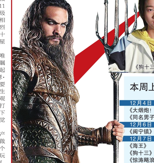 生活报记者孟飞雪 眼看时间已经进入12月,没点压轴大片怎能满足冰城影迷的需求?生活报记者从金安国际影城获悉,本周将有11部新片上映,其中最抢眼的当属DC超级英雄大片《海王》。与进口片来势凶猛相比,国产片就显得比较文艺范,派出《烈日灼心》导演曹保平密封五年之作《狗十三》,和今年戛纳上大放异彩的《冥王星时刻》来与其对抗。 《海王》作为DC在2018年推出的唯一重磅大片,自然的还未上映就备受瞩目。电影将讲述正义联盟成员海王的起源故事,半人半亚特兰蒂斯血统的亚瑟·库瑞踏上永生难忘的征途,他不但需要直面自己的特殊身世,更不得不面对生而为王的考验。值得一提的是,国内观众比北美早半个月就能观赏到温子仁打造的视觉大餐。据悉,片中壮观的水下帝国一定能为观众带来前所未见的视觉体验。 与其同天上映的曹保平导演的国产片《狗十三》虽然没有奇幻的视效,却做到让青春回归“真实”。影片描写了一个13岁少女的故事,真实呈现了少女李玩与父亲、爷爷奶奶等多对人物关系冲突,表现出对中国式家庭教育的思考与质问。此外,作为唯一入围戛纳“导演双周”单元的华语片《冥王星时刻》,影片的灵感缘起于章明10年前在西南深山采风的经历,是他对于《黑暗传》与“死亡”主题的一次现实主义探索。 本周上映新片 12月4日 《大烟炮!一千八!》《同名男子》 12月6日 《闽宁镇》 12月7日 《海王》 《狗十三》 《惊涛飓浪》 《冥王星时刻》 《进击的男孩》 《爱不可及》 12月8日 《碟仙实录》 《三只小猪2》 《狗十三》剧照 《海王》剧照