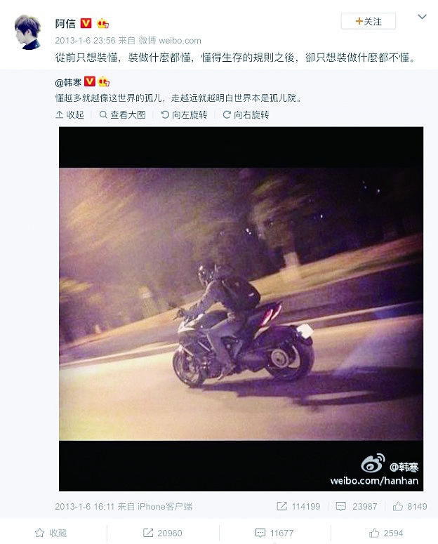 生活报讯(网娱)日 前,韩寒在微博宣布,五月天阿信将为自 己的新片《飞驰人 生》创作并演唱主 题曲,更十足用心 地将五月天曾经 的歌名串成一段 对青春的回忆,剖 白自己的歌迷心 情。而上一秒还在抒 情的韩寒,下一秒却开始偷 偷催歌,引得阿信逗趣回复,“已读,不得不回。”互动十分有爱。 而这一消息发布后,网友大呼:韩寒和阿信,用文字和歌声的不同方式,陪伴了无数人的青春和成长。两人微博多次互动,隔空喊话合作,这次终于在《飞驰人生》相会了。“韩信”组合终于出道了!据悉,该片将于明年大年初一上映。