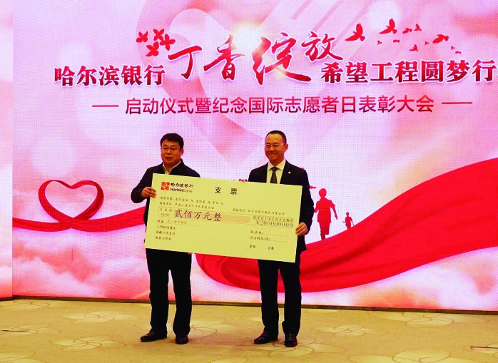 生活报讯(记者李丹文/摄)近日,以“青春公益行共筑中国梦”为主题的“丁香绽放”希望工程圆梦行动启动式在哈举办。活动中,哈尔滨银行、省青少年发展基金会及黑龙江大学、哈尔滨理工大学、哈尔滨商业大学现场签订三方协议。哈尔滨银行现场向省青少年发展基金会捐款200万元,共同发起哈尔滨银行“丁香绽放”希望工程圆梦行动和圆梦学子岗位社会实践计划。