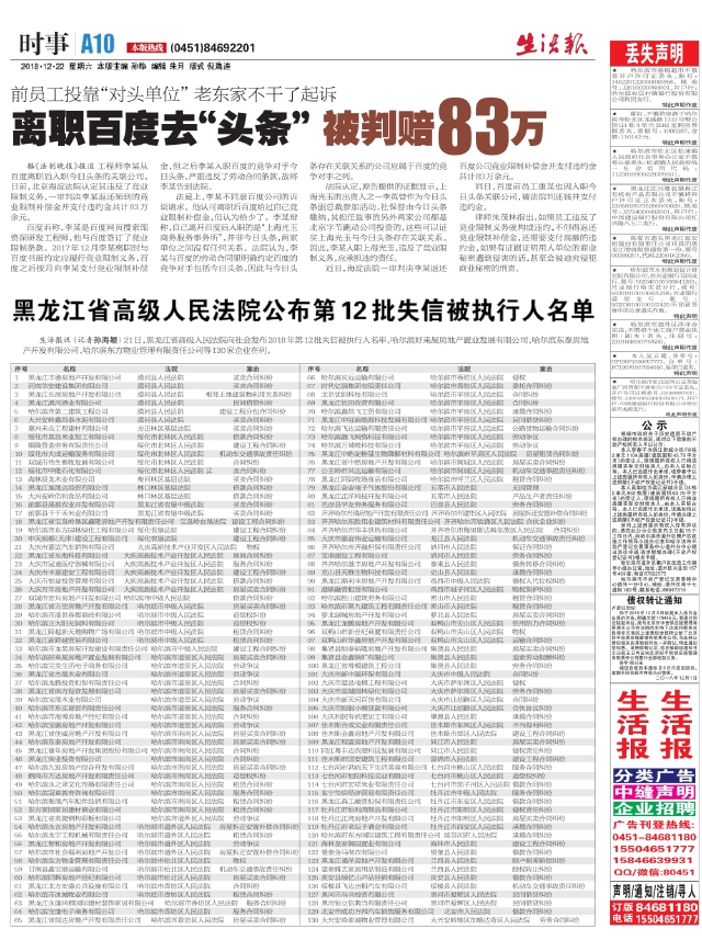 黑龙江省高级人民法院公布第12批失信被执行人名单