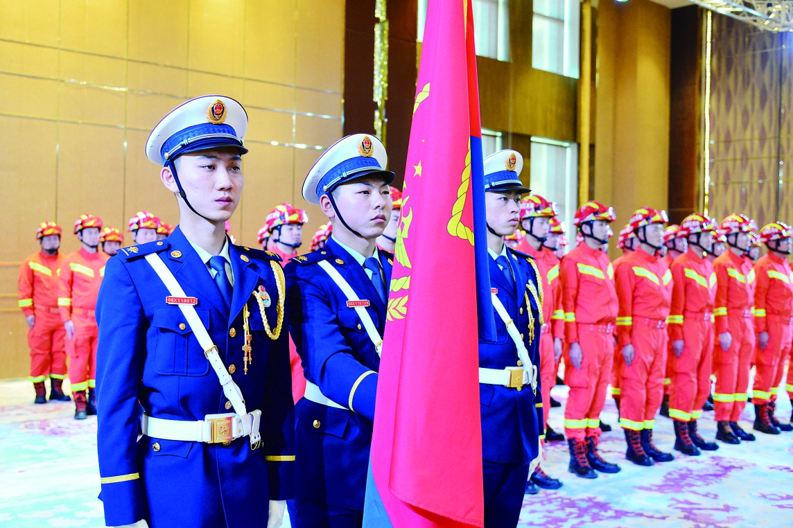 生活报讯(记者杨雪楠记者 张宇驰摄)2018年12月29日,哈尔滨市消防救援支队隆重举行迎旗、授衔和换装仪式。仪式现场隆重热烈、庄严神圣。10时,仪式正式开始,指战员精神抖擞、整齐列队,全场高唱国歌,仪仗队员护卫着中国消防救援队队旗,正步行进过主席台,全场消防指战员向队旗庄严敬礼。仪式上宣读了《消防救援衔授衔命令》,全体消防指战员庄严宣誓。