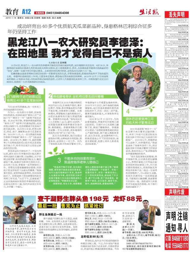 黑龙江八一农大研究员李德泽:在田地里我才觉得自己不是病人